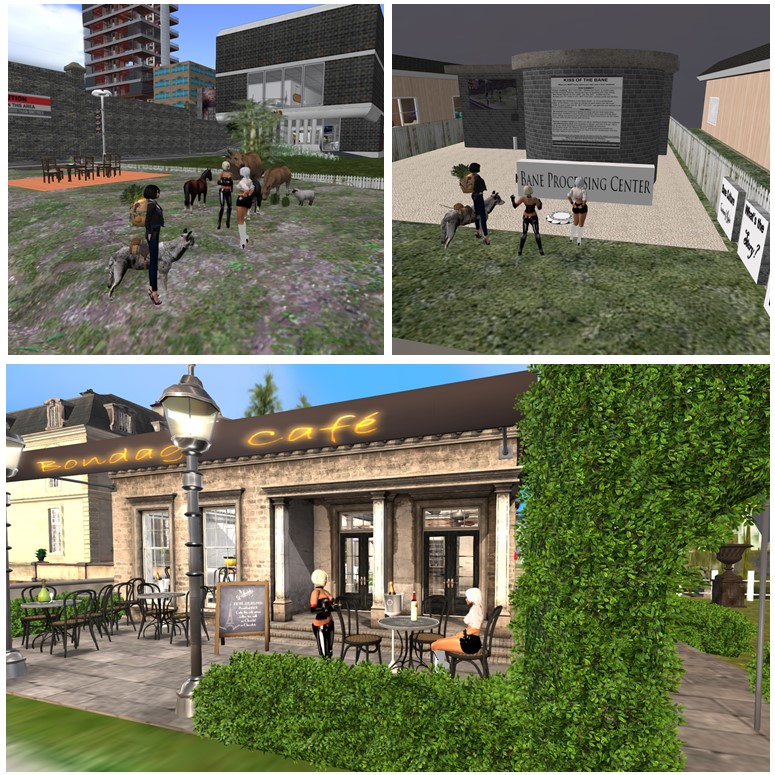 Of course you can also enter the dungeon labyrinth using stairs, if you find them. One possibility is to enter through the pod prison, the entrance to it is left of the manor. But the door from there to the dungeon labyrinth is closed from this sine. There are lots of racks and cells and cages everywhere on the whole plot as well as in the manor itself. I’m happy that Adara has also saved the Bondage Cafe from Silent Bondage Island, a place I really like.