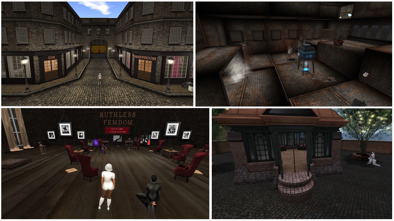 Elevate Femdom: The landing pavilion (upper left), the bar (upper right), the chat area (lower left) and an intimate booth (lower right)