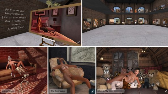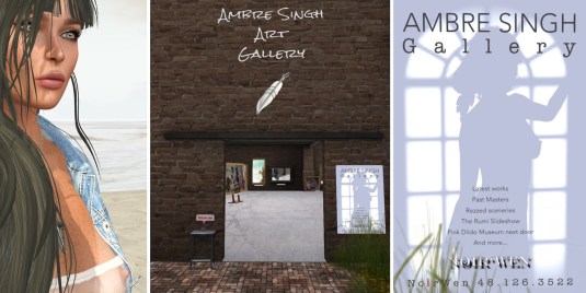 I got an invitation to see a new exhibition of Ambre Singh in her town gallery at Noir’Wen city: “Past Masters”. The invitation was quite well made. I was a HUD with quite some menu entries for landmarks also to her main gallery and to The Pink Dildo Museum, her biography, something about the exhibition and other links, like Ambre Singh’s own webpage, her store on the marketplace and her flickr page.