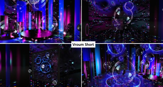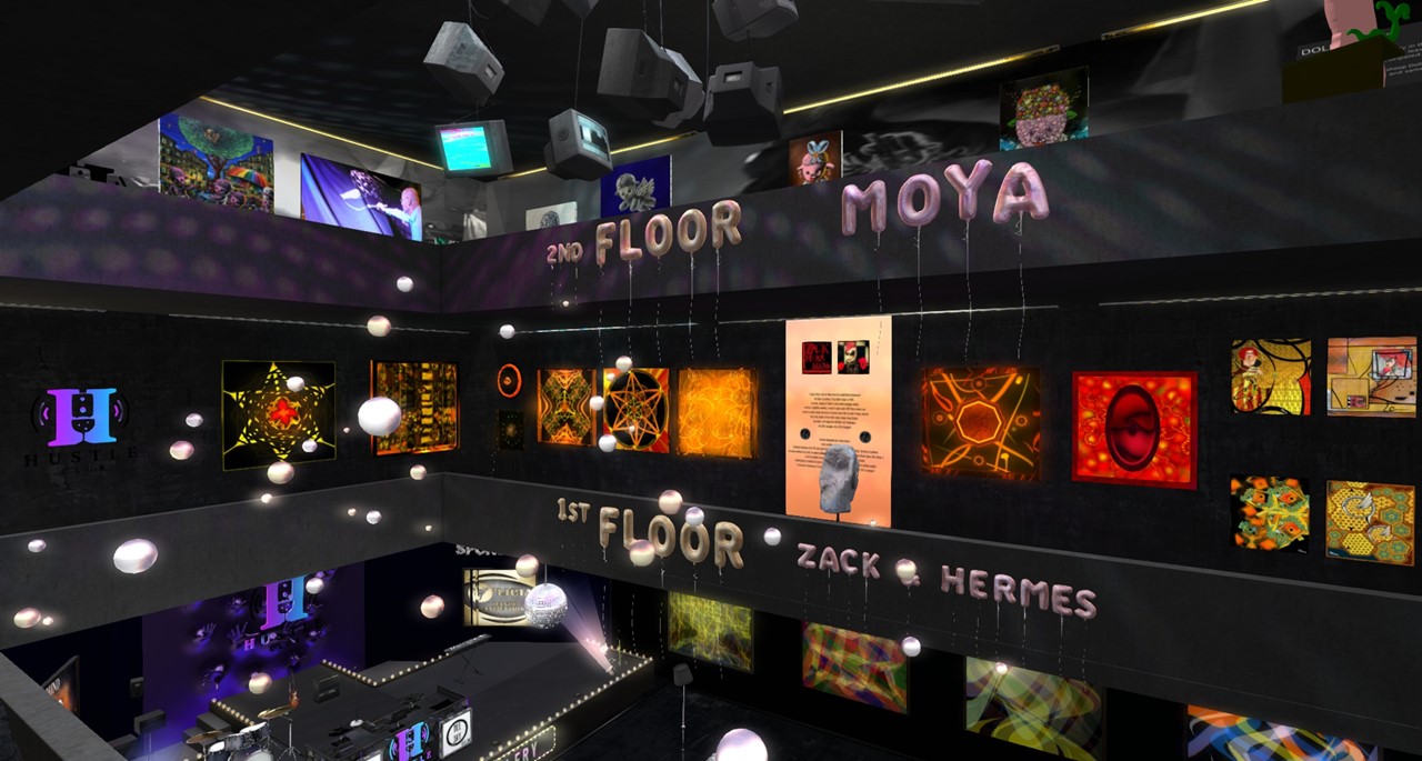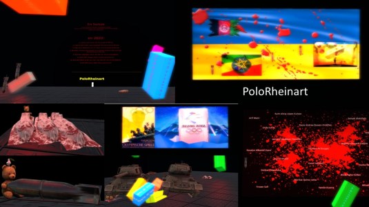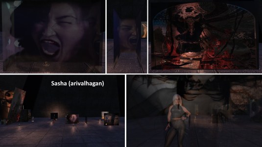 Vita Theas used her skybox at La Maison d’Aneli for a space installation on a lower level and for displaying her pictures on the ground and upper level. The space level shows several celestial bodies. I recognized the milkstreet, asteroids and the planet earth. A figure is using the earth to ride on it like on a cannonball.