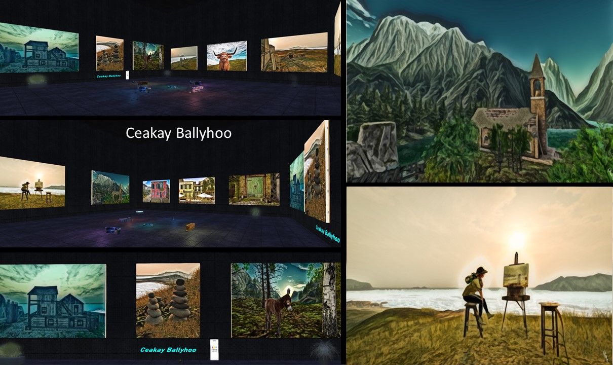 In her skybox at La Maison d’Aneli Ceakay Ballyhoo features her pictures in a classic way along the 4 walls of the box. The pictures show landscapes, houses, and animals. They are all processed to make them look like watercoulour or like drawings and honestly it is hard to say if they are based on RL or SL pictures, yet I assume the base are SL pictures as CK is a SL photographer.