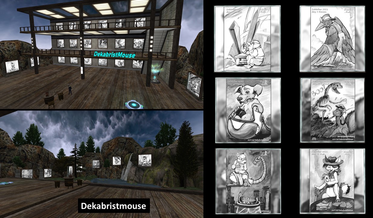 Mouse (dekabristmouse) is a Russian art student who likes furry, space and fallout themes. Mouse is in Second Life since 2001. He runs a shop for space, ground and water vehicles and for furry mods – Dekabrist’s main shop and home. At his skybox at La Maison d’Aneli he displays 31 pictures, named Day1 to Day 31, all realized in Oktober 2021. Each drawing shows a Furry, a mouse or another fantasy being and is named accordingling – or shows a partiuclar situation and the situation give the name for the drawing. All characters are created by himself.