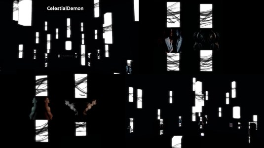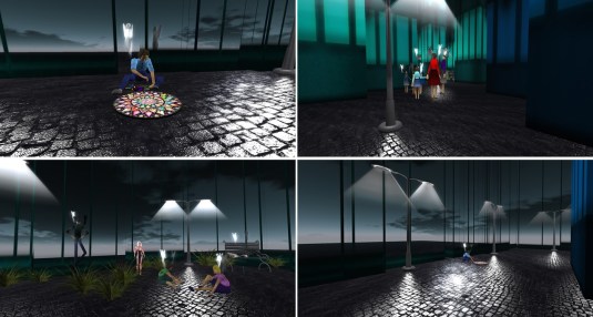In the upper level the walls are used to display Vitao Theas’ pictures. There are stairs leading up to 2 places where you can sit and watch from there. Another stair leads to a woman with a dog who looks out of a window. And the pictures? A broad variety of pictures taken within Second Life (I think at least) and processed a little bit, either to monochrome or to blurr or to other effects.