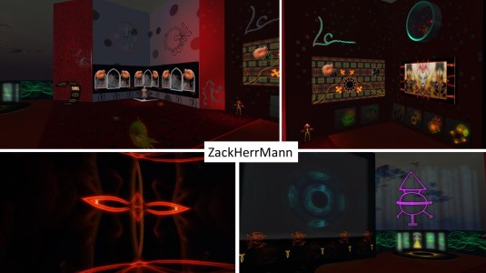 I personally am a fan of fractal art and in Second Life are quite some artists with a passion for this kind of art. Tarozaemon Rossini pretends also to be an architect. Hence he built something particular to showcase his fractal art. Most of the pictures are levitating and rotate permanently . In the center of his skybox is a huge 3D object, a flower (also fractal art?) and there’s an extra floor, from which you can firstly see the blossom of the flower and secondly can have a clower look at some non rotating fractals at the walls of his skybox.
