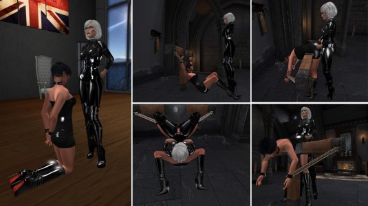 I was a bit early inworld in the afternoon for meeting with Mistress Jenny and went to club Domme a Domme, where I met a woman dressed like in the 1950ies. We chatted and she turned out to be nice yet she must be an evil in disguise as she characterized herself as dominant, strict and satistic in her profile. She had just offered to show me her home, when Mistress came inworld. I returned home and quickly caught up with Mistress, then we met this woman at Lochme. And she continued being nice, talked about her life as a decent woman in the 1950ies … and finally took us both to her kitchen. This visit ended with a warm bum for me as she used her spatula to spank me. I can imagine that “spatula” might become a trigger word in our family. Anyway, that was another nice variation of our SL.
