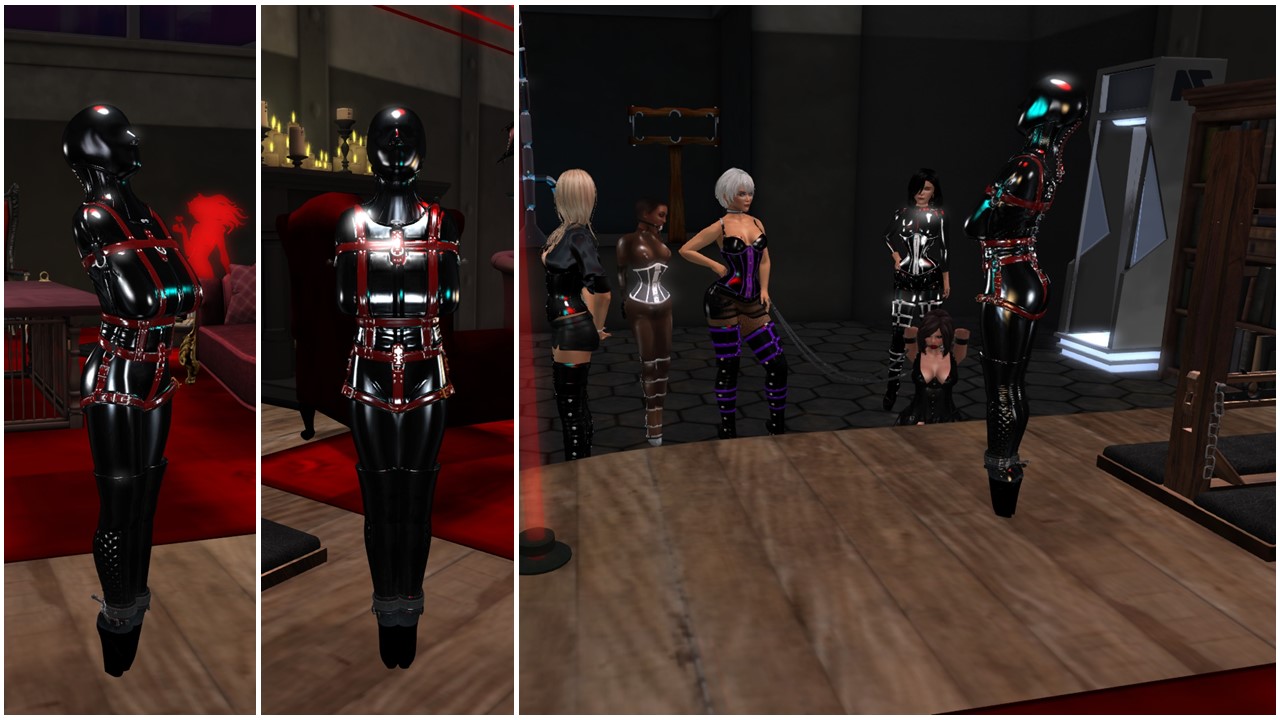 Our night turned out to be really surprising. First we met with slave Flo and Angelique at home and we caught up with RL and SL news. Then Anne (AnneWanne) showed up, our last Rubber Rockel Doll, still in her personal cage on our porch. Anne had a longer summer vacation and stayed in touch with us over this time. Now she’s back – and we do have plans for her that include realizing her “rubber project”. After some teasing and after Angelique had left us, Anne was ready to leave her Rubber Rocket Doll suit, to take a shower and to come back to us.