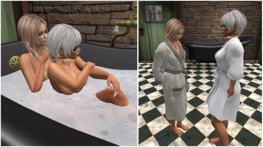 We took the slaves to Mesmerize Dungeon for a bit to wind down, then returned home where we met Angelique. I put slave kelly back on “her” new rack and we were about to leave when slave Anne came online. She was absent for quite a while now and still in the August slave outfit. Mistress Jenny had to leave and I stayed inworld longer than planned and prepared slave Anne. She got the hobble dress and will wear it together with the *KaS* hood. And after all this work, it was about time to relax with Angelique in our new bathroom. And no, we did not just take a bath *winks*.