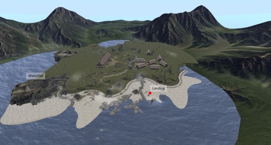“The Isles of Ice” consist of 5(!) full regions (Aerodyne, Byrd, Periscope, Crankshaft, Vernier) with 20000 prims each, but the only a few of the total 100,000 are actually used. They are all built in a row and I was not able to make a full overview map for orientation. Hence I splitted the overview.