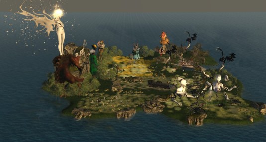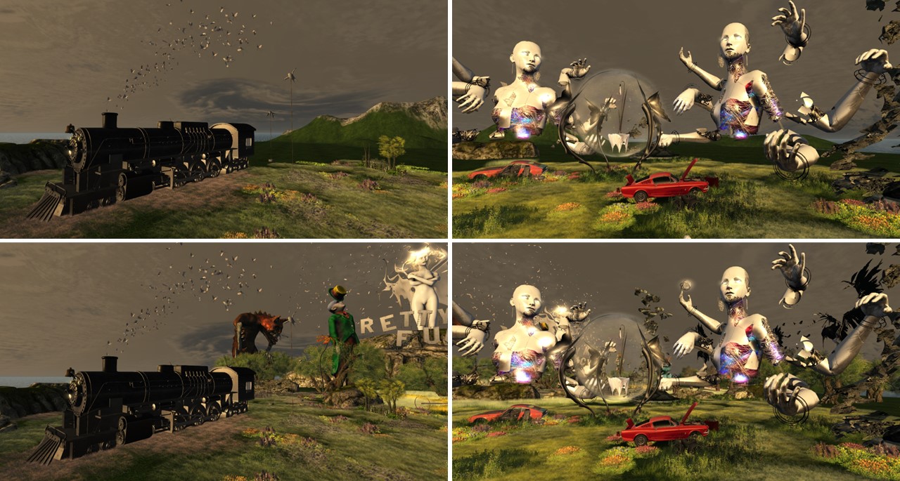 There’s a whole circus in the mountains, the figures are from Silas Merlin. Other objects are from Rebeca Bashley and from Fresh3D (the scarecrows for example). You hardly know where to look first. The only common theme I could gather form all the art is: Enjoy, don’t take everything too serious, something nice in these days of war in Europe. Who knows, perhaps I didn’t realize the message … it is just “pretty much fucked” *winks*