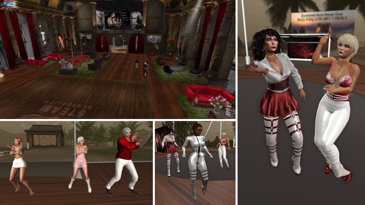 November 30th: Jenny and Diomita visiting “Atlas Stean & Sensuality” (upper left) / Della, Starry and Fox dancing (lower left) / Jenny, Diomita and slave Flo dancing (lower middle and right)