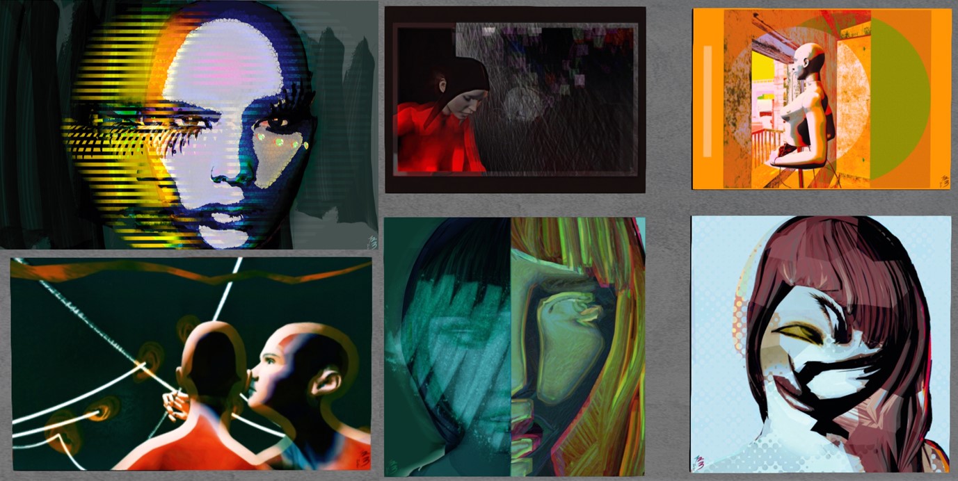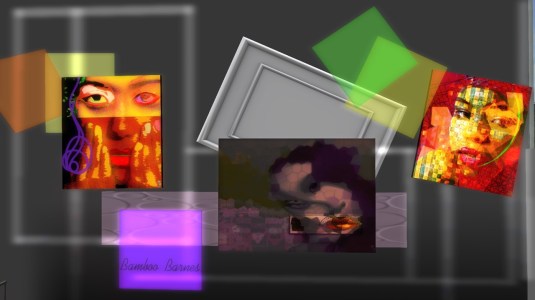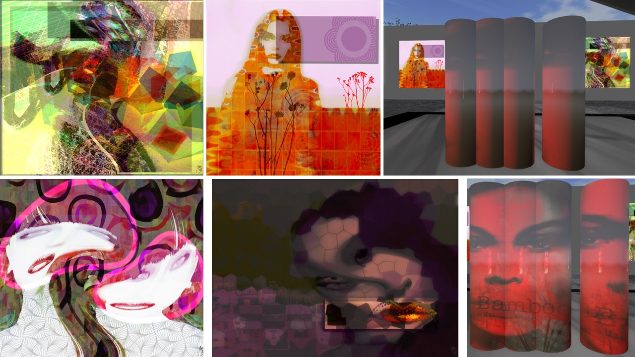 Bamboo is in Second Life for over 14 years already, painting software & photoshop are her best friends. Bamboo had many exhibtions and appearances in the Second Life art scene and in 2018 she had her first exhibition in real life: “I create what I see but maybe you won’t, they are about people’s reality and mind.” Bamboo’s art is a mixture of abstract forms, of people and photographs. Most pictures are colourful and it is in the eye of the beholder what we see in her pictures. I myself saw her work the first time at La Maison d’Aneli during the Holiday season 2019/2020 (read here). I also saw her exhibition “Marginal Mannerism” at DixMixGallery in April 2021 (read here), the exhibition “Meant to be” at Itakos Art Gallery last year (read here), I saw “Conjure” at FOCUS Magazine F.A.I.R Gallery in August 2021 (read here) and just recently I saw “Mindstorm” at IMAGO Land (read here). I also had a look at her flickr page.