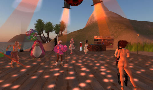 As this last week was about bondage and having Tyra and Virgo as our “guests” the party on Friday night consistently was about bondage. Again we enjoyed great music from Virgo who was nicely tied down with Tyra. And several other toys attended the night tied down. This is SL and here you can dance to some extent even tied down and more important – you can also spin records!