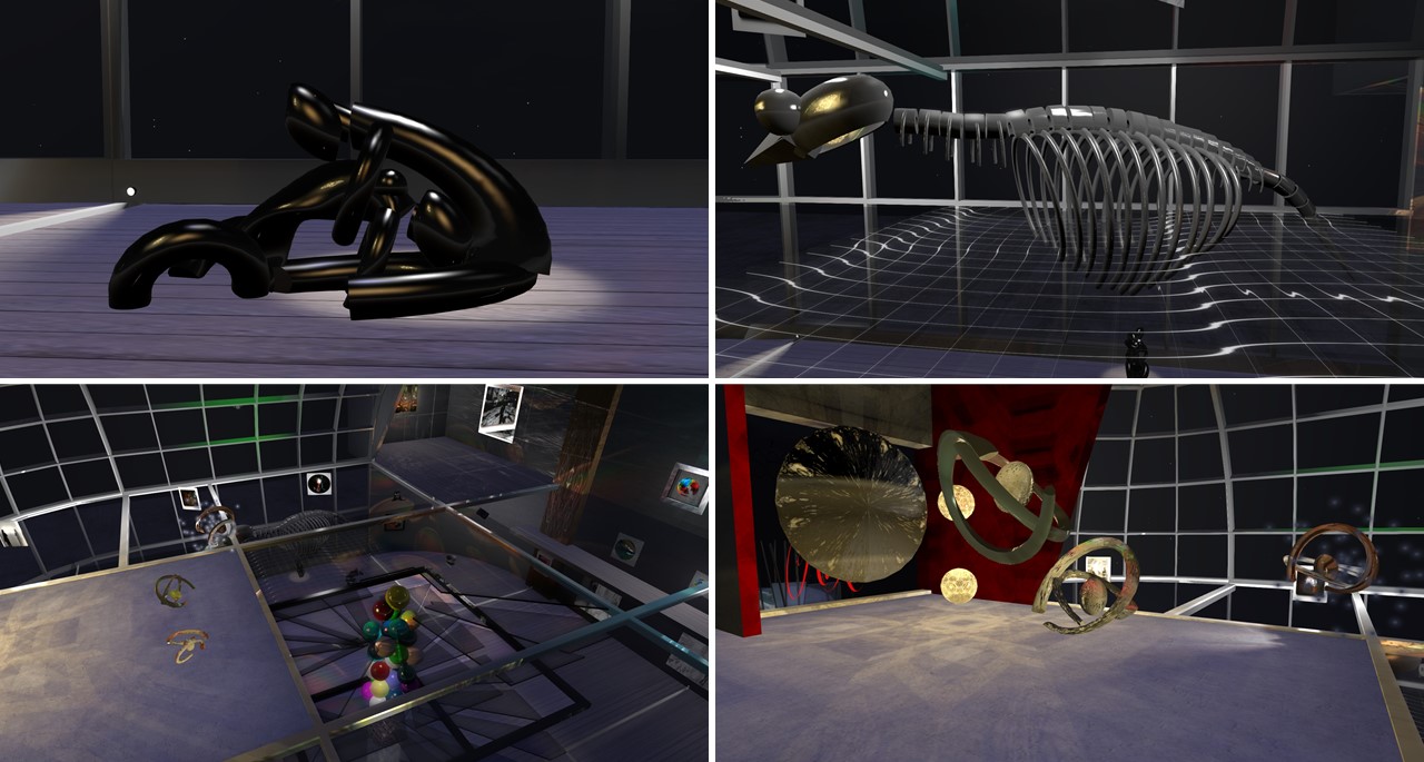 There are many objects, ranging from a huge dinosaur skeleton, to circling planets, from human like sculptures to pure fantasy objects. The walls are used to to showcase the 2D art. Most of the art on the floors above ground is from Puce.