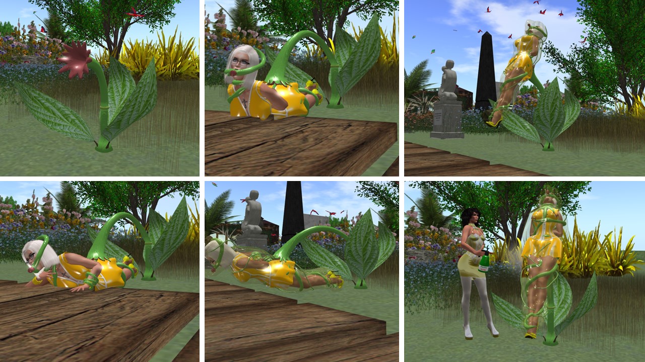 Mistress had annouced running late at night and so did Flo … and I ran late as well. When I got inworld Mistress was already at our house, hence I went seeing her. Mistress had panted a new plant … a giant sluper plant .. and she ordered me to smell at it. The result is seen on the pictures – funny! And some fun for visitors *winks*