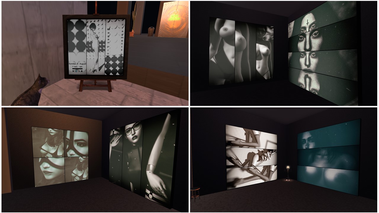 I saw Sweet Susanowa’s art the first time at another exhibition at La Maison d’Aneli back in July 2019 and later once again in May 2020 (read here). Sweet joined Second Life 13 years ago without thinking about any exhibition at a gallery. She is a photographer now in real life as well as in Second Life. The 4 walls of her skybox at La Maison d’Aneli show 4 different themes: monochrome female portraits of women at different ages, monochrome snapshots of a couple in love enjoying each other’s touch, colourful scenes of party life with a touch of pop art and pictures of female display dummies that look like the bluprint of a female.