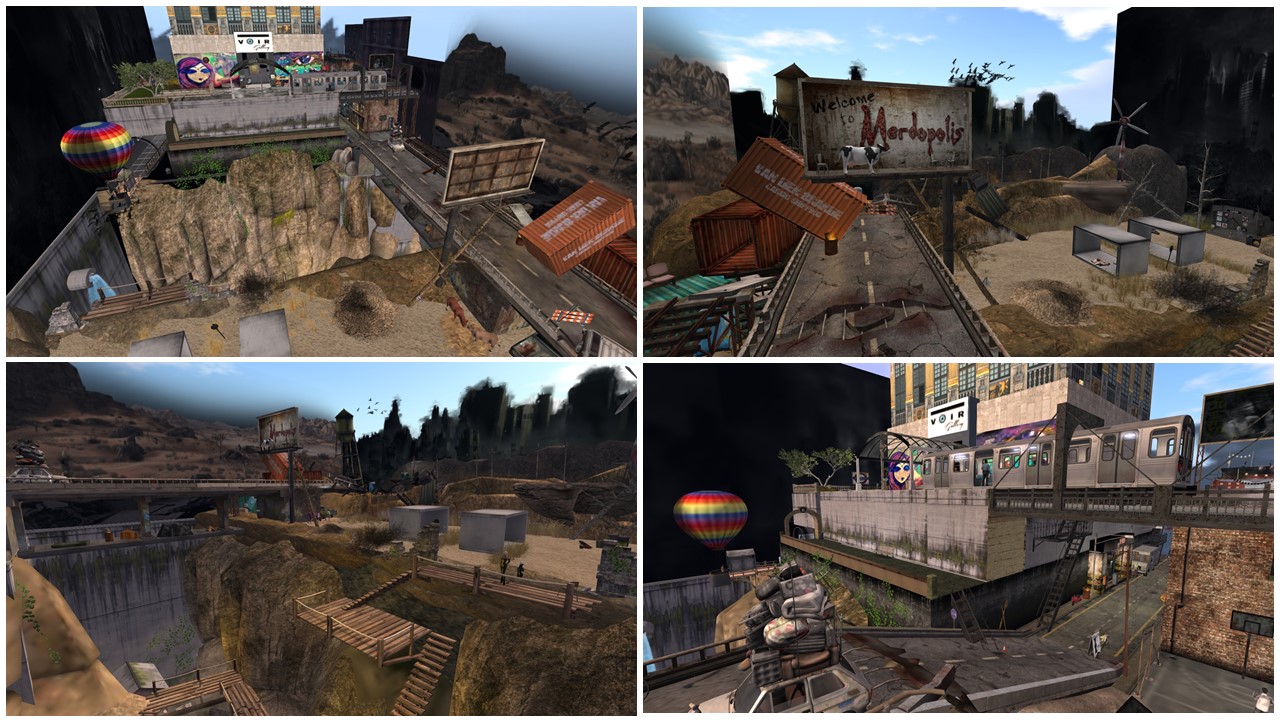 “The theme is always the journey, constant in the life of the artist: the movement, the change, the exploration, emigration, until the banal transfer for work reasons. In Second Life she found another dimension to travel to especially walking on the streets and driving a locomotive on the remarkable heterocetera railroad. Impossible buildings alternate with