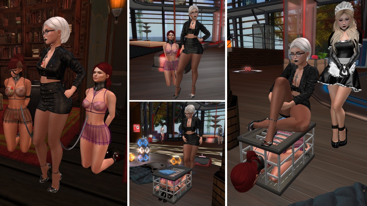 Thursday, May 11th, I was inworld almost the whole afternoon, but was also with one eye in my RL … hence I had longer times being absent. Kitty was up early and I met her at Lochme and took her with me to club Domme a Domme. When slave Kari (karifinnagan) came inworld, I picked her up at home from her cage and took her to club Domme a Domme as well. She had some longer focus time there, after Kitty had left. Later maid Monique (MoniqueDefoe) joined us. I had some entertainment at the club and the opportunity to talk with slave Kari as well as to tease her.