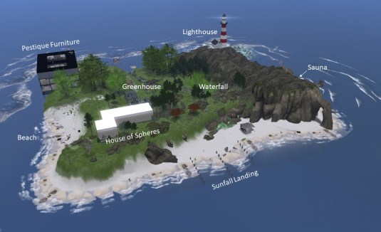There is much more to discover. With the sound turned on, you will notice that Faith has selected the music and ambient sound according to the spots you visit. Hence you get music from The Beatles when you visit The Beatles hut, you get Christmas music visiting the Christmas sphere and you get chill-out music at the beach, the place I sat down and listened to the music while writing my simploring report. I once zoomed out to get an impression how this beautiful sim was made. In the overview you can recognice the spheres, that dive the according area of the sim in another light.