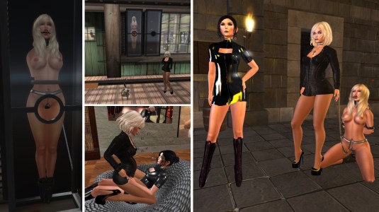 I expected that Mistress allows me to dress again but after she had dressed she kept me leashed and once again left. I was teleported to the Bondage Ranch, a place that I hadn’t visited in ages. But Mistress had been there not long ago and had told me that there were a lot of changes. I was dragged naked through the whole sim and had difficulties to follow Mistress (due to lag). That made me work. Finally we arrived where we had started and Mistress asked me to ensure that my relay was switched on. We dragged me into a house and I had to sit on a rug, then Mistress enjoyed seeing her Ehesklavin getting abused.