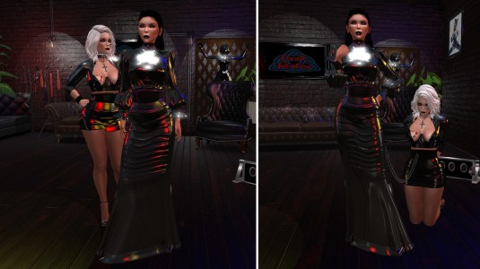 Mistresses both looked stunning in preparation for the Friday night party. I really enjoyed the music, a little bit of chat with Mistresses and the mostly (h)armless dancing. I was just about to leave for my RL when Mistress Jenny had me wait a moment…. Mistress Jenny then surprised me by using Mistresses’ nose ring that I wear to restrict my local chat leaving me only to emote. Mistress Jenny doesn’t usually restrict me – often leaving that to Mistress Diomita. Mistress Jenny then promised that Mistresses intended to tease me all weekend. That night I went to my RL bed thinking only of Mistress Jenny. That night, as I often do, I had RL dreams about my Second Life (Mistresses know how to get into my head). In this one I was crawling naked and leashed through a very busy and Psi’s Realm trying to follow Mistress Jenny.