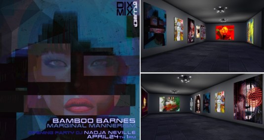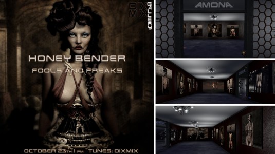 I visited the exhibition “Fools and Freaks” by Honey Bender at DixMix Gallery in room Amona. The exhibition consists of 12 pictures based on SL pictures, all showing females in freaky or fetish outfits, not erotic on a first glance, yet intriguing and tempting on a second glance. Just one pictures shows a male and a female.