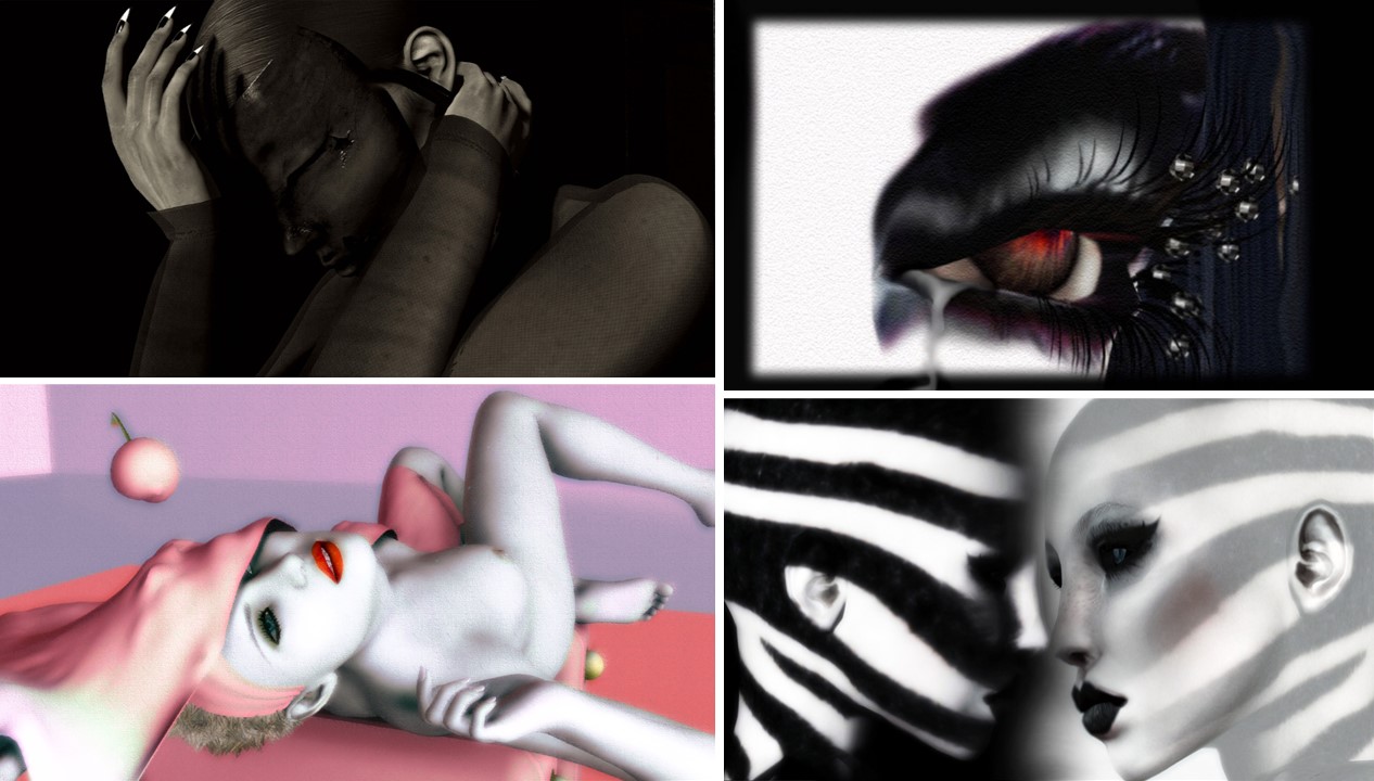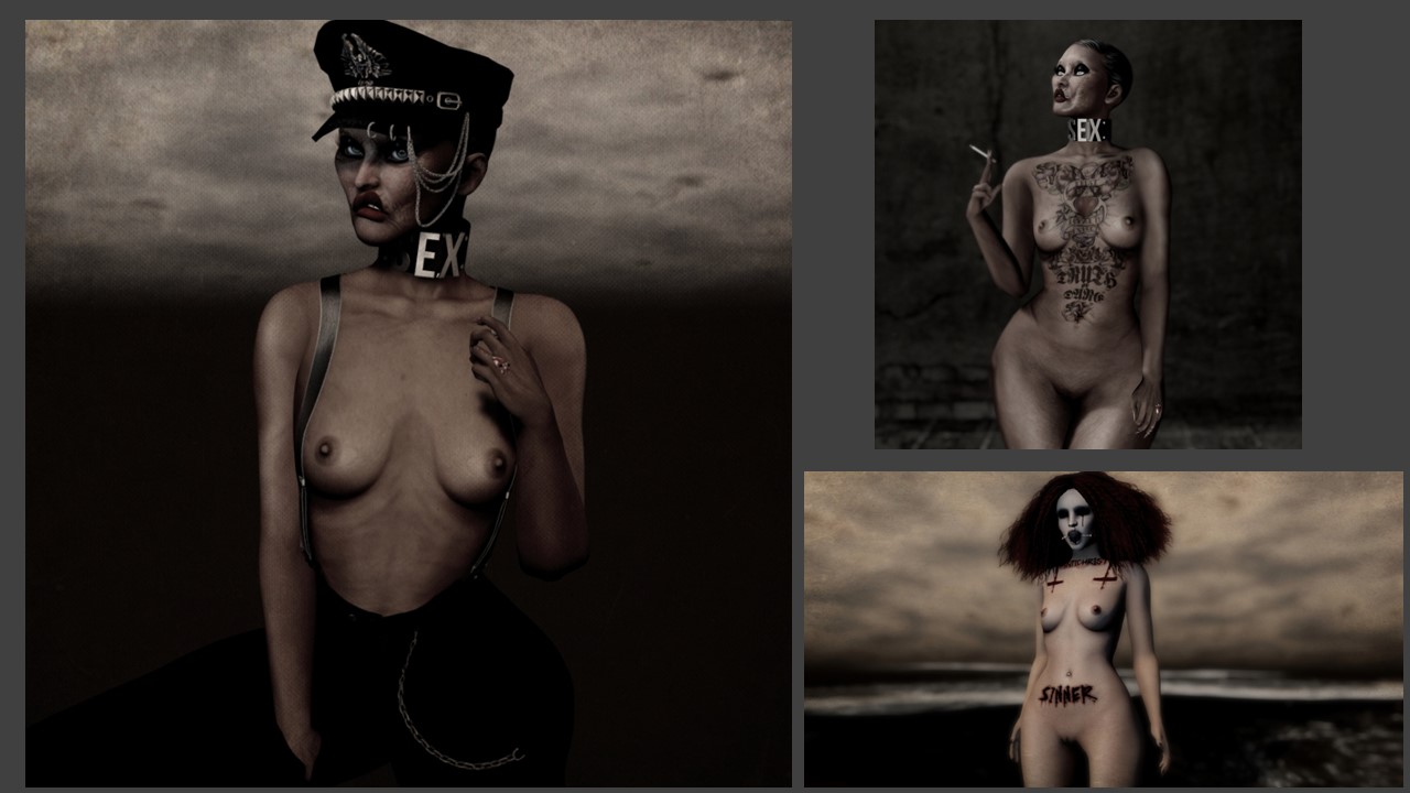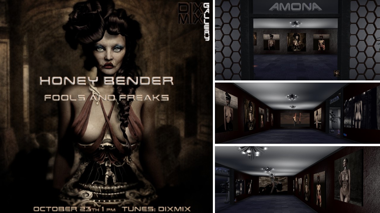 I visited the exhibition “Fools and Freaks” by Honey Bender at DixMix Gallery in room Amona. The exhibition consists of 12 pictures based on SL pictures, all showing females in freaky or fetish outfits, not erotic on a first glance, yet intriguing and tempting on a second glance. Just one pictures shows a male and a female.
