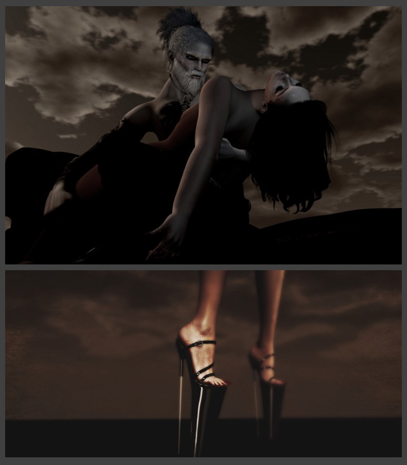 I had seen Honey Bender’s art at DixMix Gallery in April 2021 the first time. Her style is quite unique. I like the way she processes her pictures turning SL photographs into art. All pictures of “Fools and Freaks” are kept in dark vintage colours. Honey added shadows and light at the right spots. The spectator is tempted to look at details. Yes the women are freaks yet even more you want to satisfy your curiosity, you begin to make up a story. Why are they like this? …. are they as freaky as they look like? What makes them being a freak? And what is a freak? Do you have to be a fool to be a freak? And is it bad to stare at the deformed lips?
