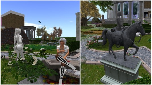 I was not surprised when I got to “Art Gallery of Accidental Entanglement“. The place has a modern gallery building and a large park. In the park there’re many podests and traps where avatars can be transformed into living statues and dolls, that do look real. The only way to differentiate between statues made of marble and living statues is the tag above the living ones. I roamed around the park and looked at the statues. I liked in particular the equestrian statue, a living statue by the way.