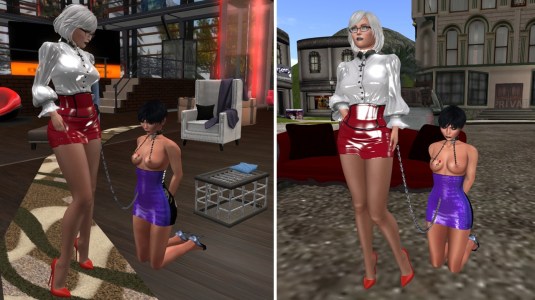 At night Mistress was prevented from coming inworld. But slave Flo was present again. I first made her clean the house. There was not too mucht to do as Ebony had cleaned it in the afternoon. Nonetheless, it was perfectly cleand afterwards. I had three rounds of greedy with Flo. We were just done when Angelique showed up. She had attended her new institution and was still in her student outfit. I wanted to go clubbing a bit and Angelique changed into something suitable – wow! Again Angelique had created a great mix and match outfit.