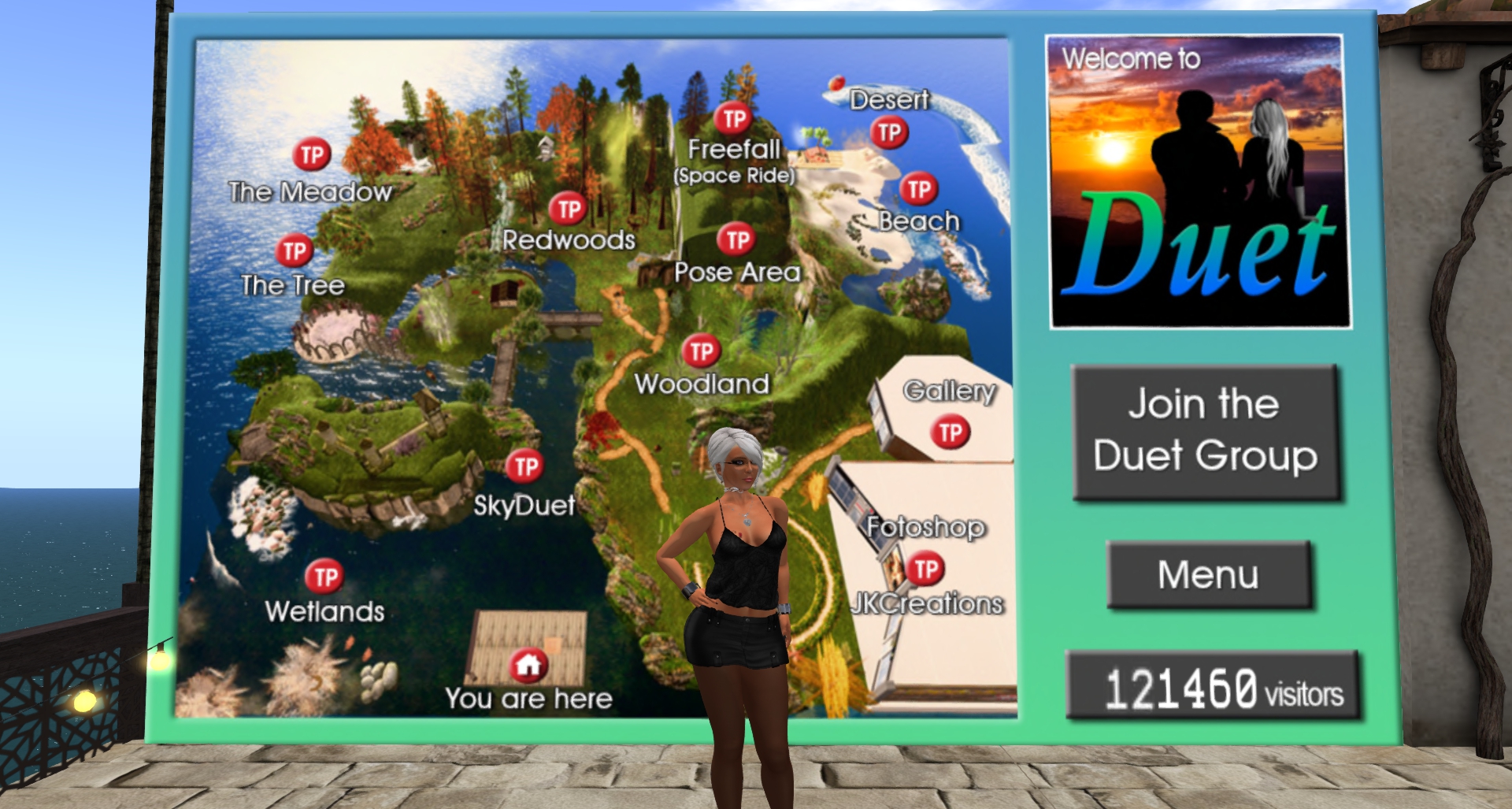 Back to Duet. Let’s start with the description given in the landmark “Set Home and rez here! Welcome – enjoy our photographic scenes, props & poses! Come for the space ride, cloud dance with ad free radio, tai chi & camp or romance & date in our woods, meadows castle, beach. No sex or nudity.”