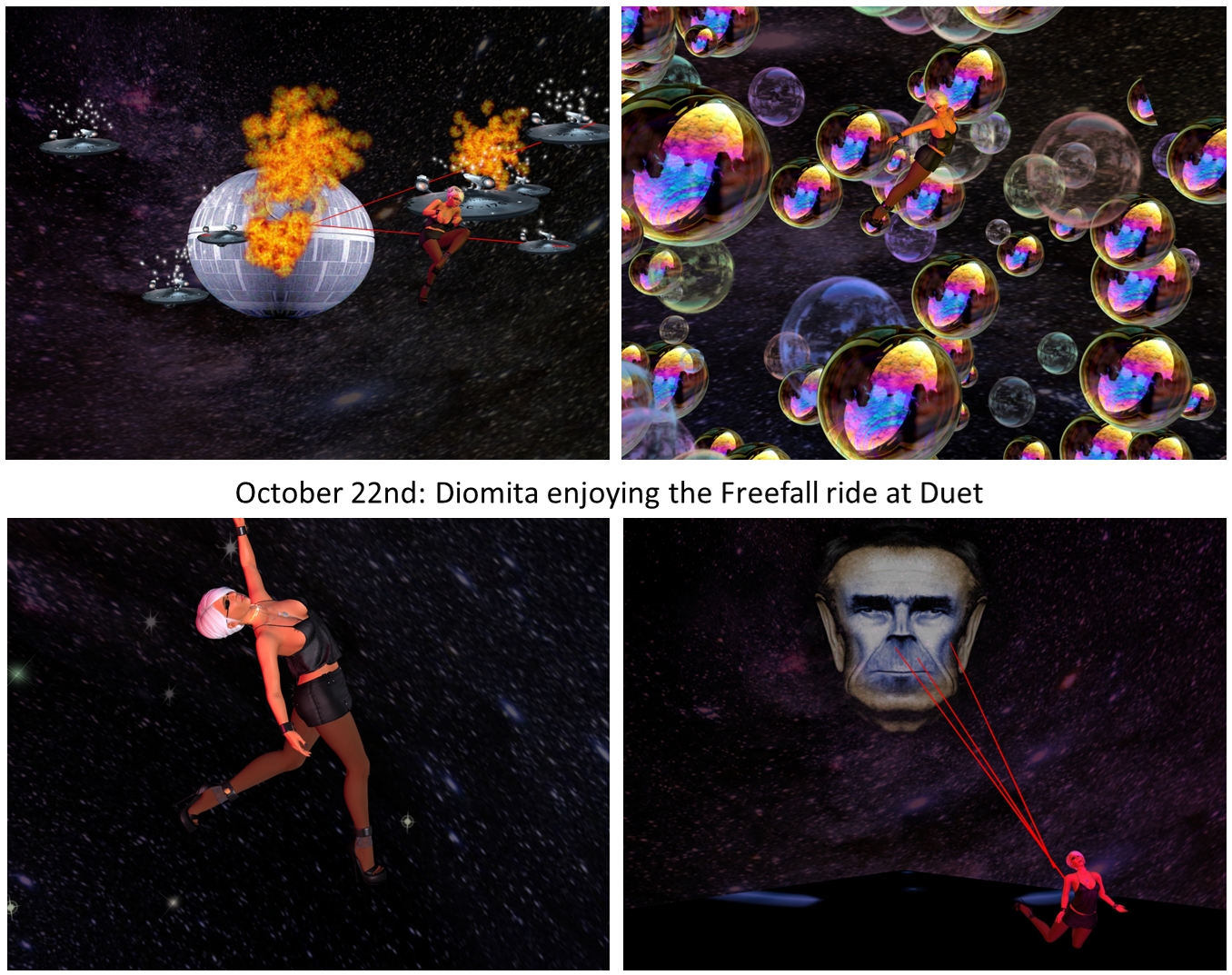 That sums it up quite well. Duet is a sim for photographers and it is perfect for cuddling and dancing. Joining the group provides rezz rights and admittance to some areas and I think the L20 are really fair. When you enter you get a notecard with the sim rules as well as a list what to do at Duet, and there is really a lot to see and to experience. Riding the Freefall is for sure the unique attraction. This 8 minute space ride is crammed with animations, visual and audio special effects. Here are just a few impressions, it is awesome and I want repeated the ride together with Mistress as soon as possible.