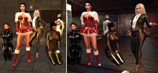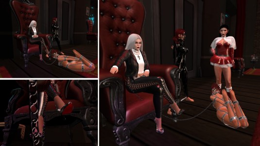 I returned in the afternoon. slave Holly was present and I took her to club Domme a Domme. slave Lily (Lily Bloodrose) joined us there. I had fun exposing the slaves and showing my own outfit. We chatted and I played a bit with the slaves’ restrictions. We stayed about helf an hour, then we moved on to club DeLust. Before I logged off to tend to my RL I had something on stock for the slaves, a treat for slave Holly and a premiere for slave Lily – my champagne. First slave Lily watched while I donated my pee to slave Holly. I left a bit for slave Lily intentionally. Not too much but she got the taste and I seeded the desire for more. Then I logged off.
