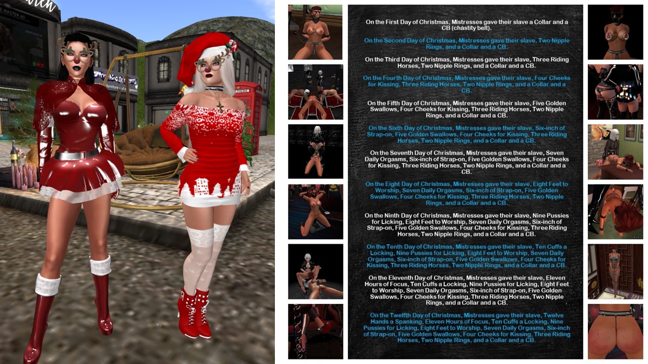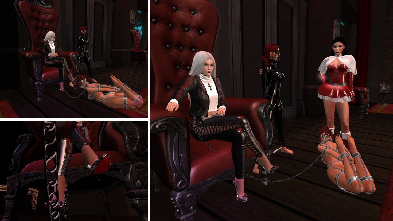 I returned in the afternoon. slave Holly was present and I took her to club Domme a Domme. slave Lily (Lily Bloodrose) joined us there. I had fun exposing the slaves and showing my own outfit. We chatted and I played a bit with the slaves’ restrictions. We stayed about helf an hour, then we moved on to club DeLust. Before I logged off to tend to my RL I had something on stock for the slaves, a treat for slave Holly and a premiere for slave Lily – my champagne. First slave Lily watched while I donated my pee to slave Holly. I left a bit for slave Lily intentionally. Not too much but she got the taste and I seeded the desire for more. Then I logged off.