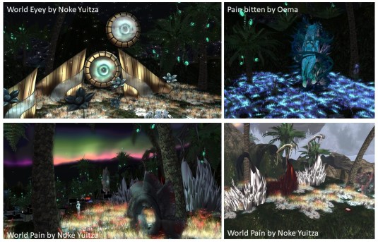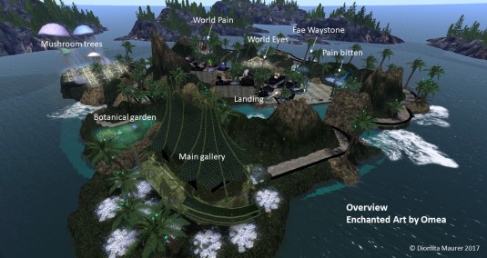 Elicio’s store is embedded in the Lost Halls floating castle on another height level of the sim and it is there you’ll usually arrive if you don’t have another landmark. The store is a piece of art itself. Besides the vendors, you might not realize that you’re in a store. It is fun and enjoyable just to walk around and the look at the architecture and the plants and light effects. You can purchase most of what I saw, I think at reasonable prices. If you want to buy larger builds you can see them at a seperate rez platform. I went there and rezzed a 200m tall fantasy tower (The Tower of Dawn). The way Elicio placed the products is very tasteful and I couldn’t resist to buy some of the glowing flowers and gras for our own sim. There’s also a teleporter network to travel around the different places and attraction at Cerridwens Cauldron.
