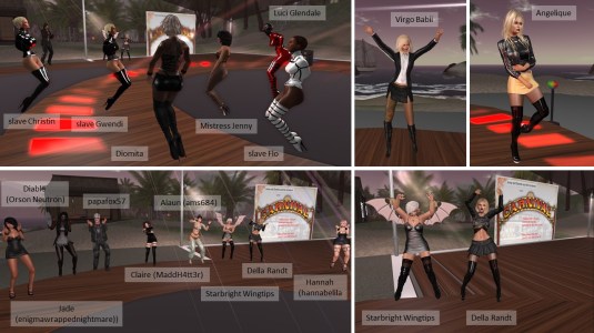 November 29th – Friday night party: Claire (maddh4tt3r), Della Randt, Starbright Wingstips, Firefly (rmf361sim), Jade (enigmawrappednightmare), papafox57, Mistress Jenny, Diomita, slave Flo, slave Gwendi (upper row) / slave Flo, Angelique, Jammy Serendipity (navanaxsacratus), vero Hartmann, Sarah Fhang, Ann, Starbright Wingtips, Firefly (rmf361sim), Sara (SaraRandall) (lower row)