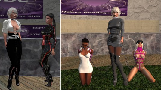 March 13th: Mistress Jenny and Diomita at Heavy Bondage Club, at club Domme a Domme, at home with slave Flo and at our skybox