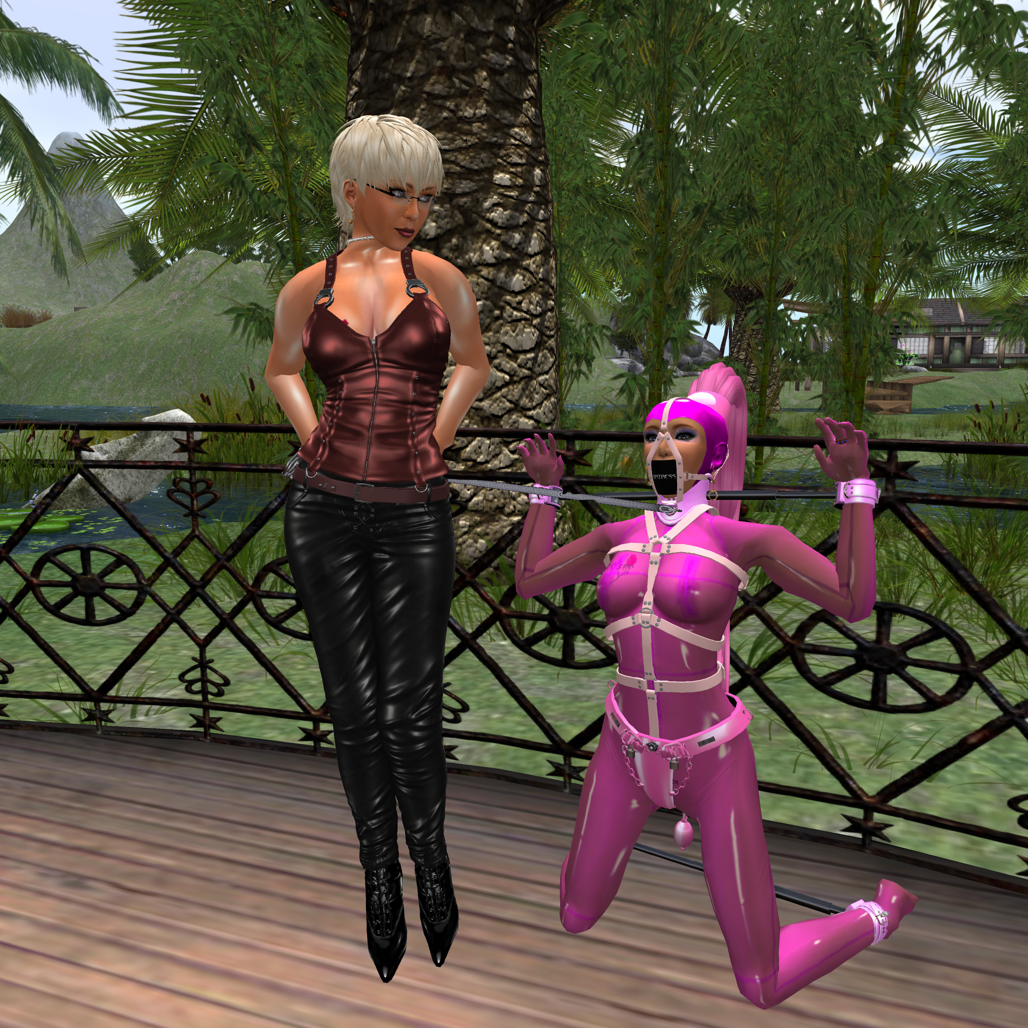 Jenny has been on a short vacation 8 days ago. It’s not the first time that I locked her before she left for vacation. And Jenny likes doing that with me before I leave as well. So it is kind of a tradition. It feels good when you leave and good when you return. This way the vacation is a bit embedded into our SL. But this time it had to be something special and unusal, as Jenny asked me to be strict and to choose something submissive for her to wear. Now, what is a submissive dress? It can be something very slutty or something humiliating or …. pink! Jenny’s collection of pink isn’t that large. There’s one pink latex catsuit, but that would have been too easy. So I took her shopping and we bought a pink latex catsuit and a pink latex hood with a latex ponytail. Then I added the vixen cuffs, a leather harness, a harness gag and a chastity belt. Now she looked like my little tied-up pink doll and was helpless. My poor mistress, domme and owner was pushed back into her life as my slave, my slut and Ehesklavin. Seeing her like this brought my domme side to flourish and it pushed her into subspace even more. Back to the roots, to the days we met close to 7 years ago.