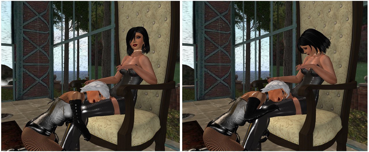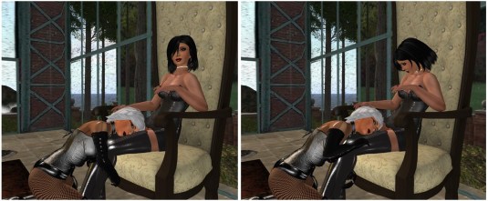 When I returned home from my simploring tour to “Aly’s Fine Art Gallery and Jungle” Thursday, August 17th, Mistress came just inworld. She didn’t talk much, instead I got orders to wear cuffs, which she locked. She added an inflatable gag, leashed me and took me to club DeLust. It still surprises me how self confident and strict Mistress takes what is hers with no doubt. At club DeLust she first leashed me at the wall, then sat down in a chair and began chatting with another guest, Keiko (keikonami). Keiko, who I know from an simploring tour to her castle (read here) congratulated Mistress Jenny for having enslaved her former owner (me). She told Mistress that she gave up her castle (what a shame!) but has a new smaller place and promised to invite Mistress and me over some day. As I was gagged I just followed Mistress’ and Keiko’s conversation silently. I do remember that I did that with Jenny as well many years ago. After a while, Mistress took me next to her, kneeling between her and Keiko. And when a sub of Keiko showed up, I was finally allowed to sit at Mistress feet.