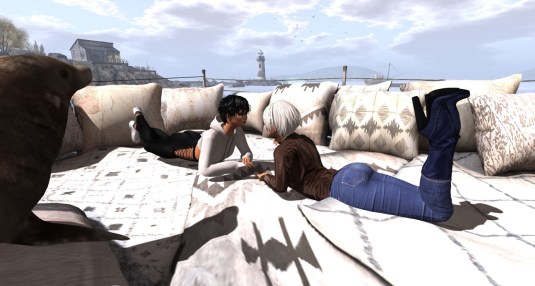 I explored the village that really has a Mediterranean touch. A large villa with pool is close to the landing point. The houses at Florence At Low Tide are typical for the region, most of them are not furnished though. Quite close to the landing is a bar and an event area. I sat down and enjoyed the atmosphere before I walked to the lighthouse. Also on this side of FLorence At Low Tide the tide caused boats to lay on the ground. I peeked inside of a smaller hut and discovered a piano and a nice polstered lounger, hence I called it “Piano hut”
