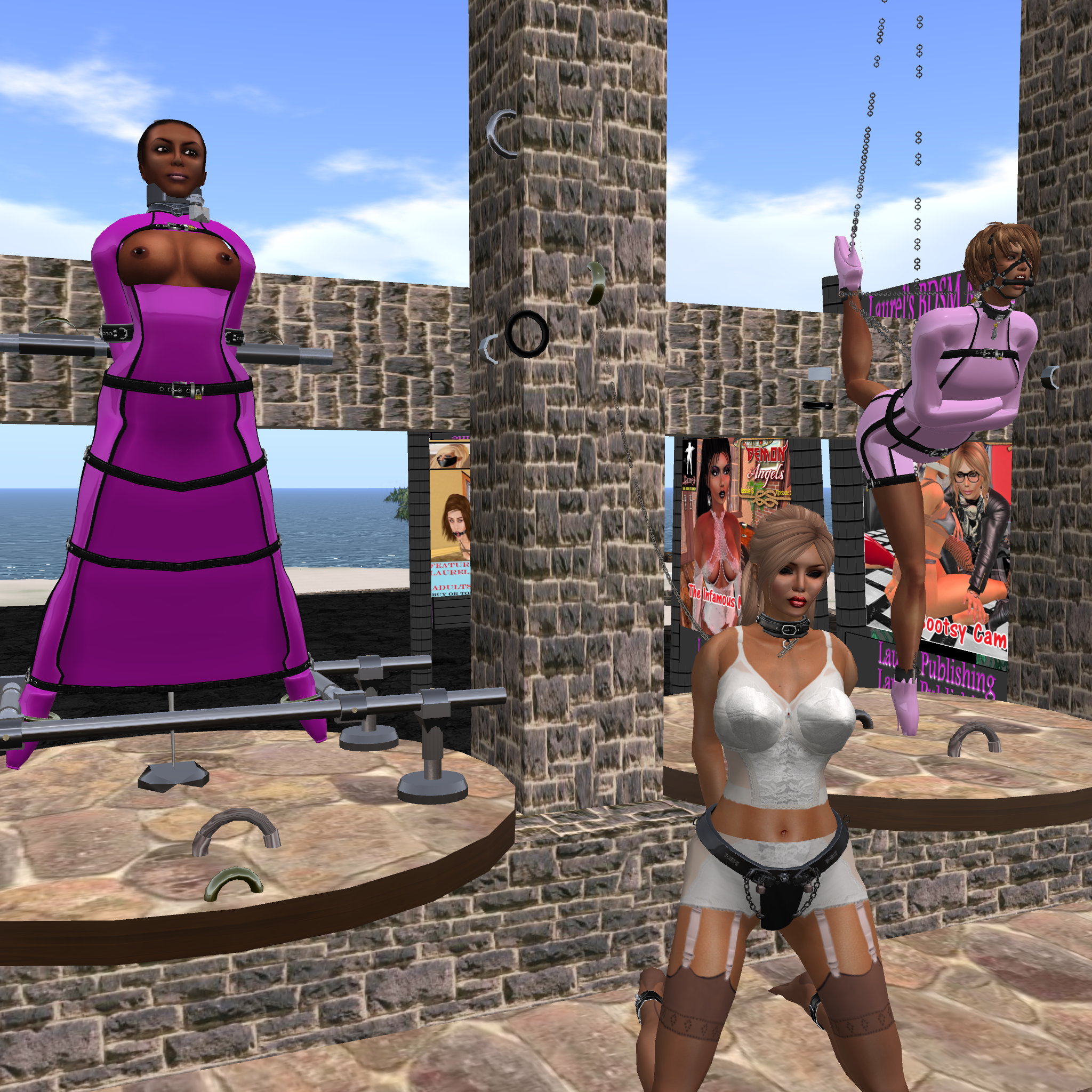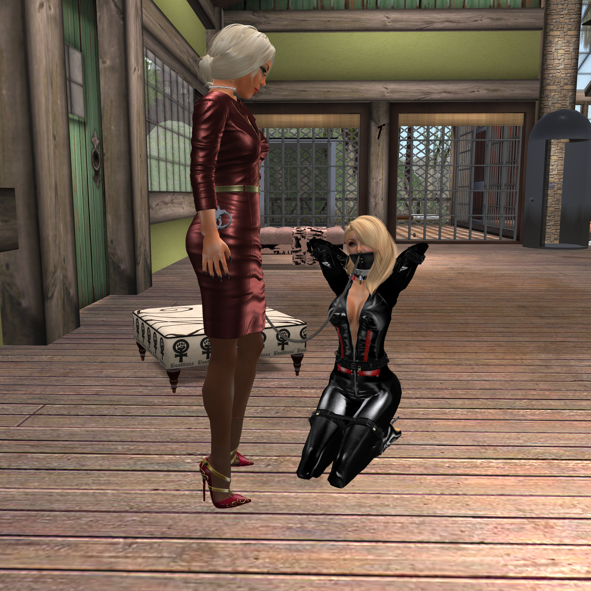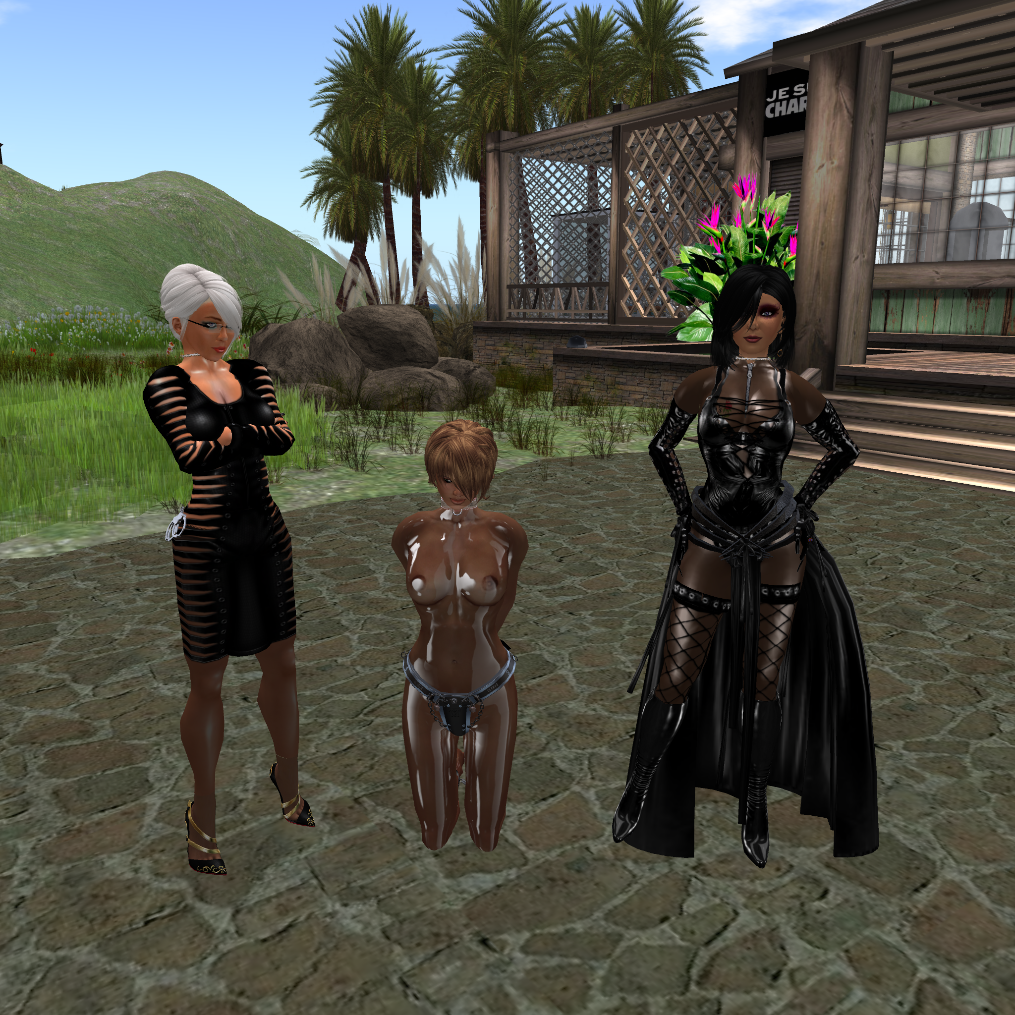 Over a month ago we put slave Flo into her red latex catsuit adding a red latex hood with black eyepads and a blonde pony tail. That day the new outfit for our slaves came to life. The outfit has been further developed and slave Adarra first added the “Maurer”-rose to the left buttock, then the national flag of the slave’s residence on the right buttock. Every slave got a different colour in a shade of red, pink, violet or liliac. And not only our permanently owned and collar slaves Flo, Gebby, Adarra, cecy and Nina were dressed accordingly but also Kitty. In addition we had or have slave Po, slave Mii, slavin C and slave Pauline in the very same outfit. In total 10 (!) slaves. When we go out, they add colour to every sim and they attract attention, in particular when they come online together. Everywhere we go with the slaves we get compliments and also application to join the group.