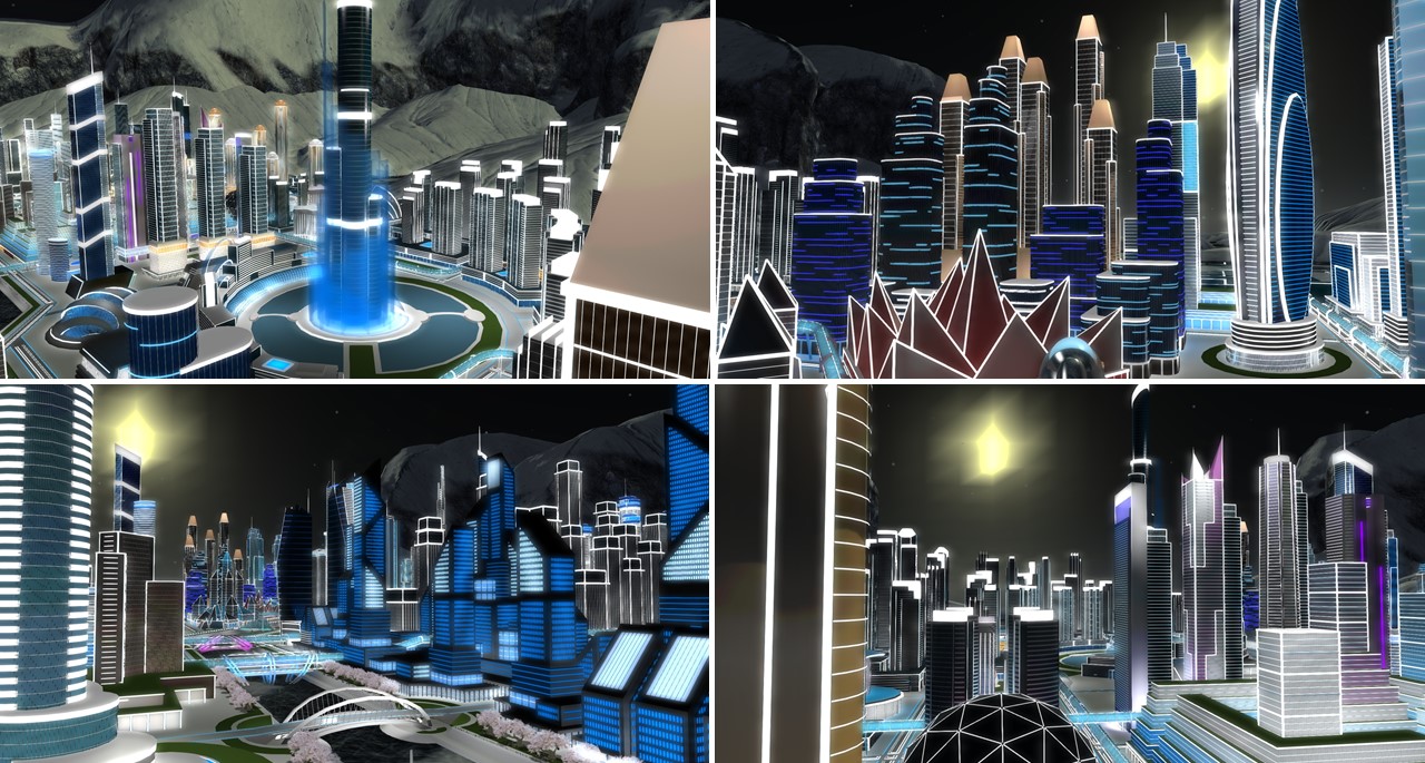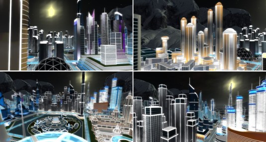 – the second one aims to create a stronger sense of immersion on Secondlife. How to push the 256m limit of a Sim and give a city its natural dimension compared to our character? The solution I found is to build on a 1/10th scale and make the avatar invisible, apparently enclosed in the cockpit of a vehicle whose size and speed are made consistent with the scale of the buildings. Thus, it is in a city of 2.56 km side that you move, which is the equivalent of the surface of 100 normal Sims. The offsim background emphasizes this scale effect since these hundred meters high hills really seem here to be mountains topping up the skyscrapers.