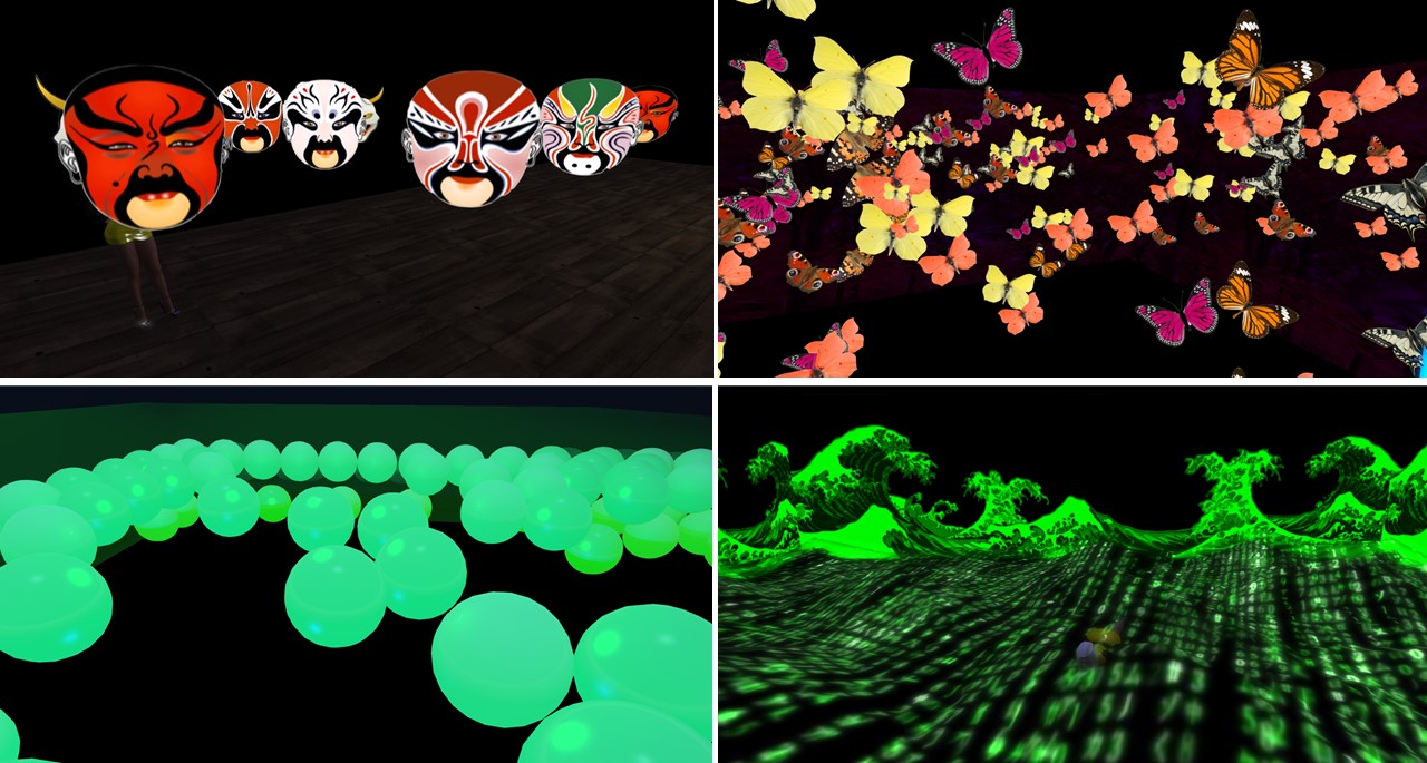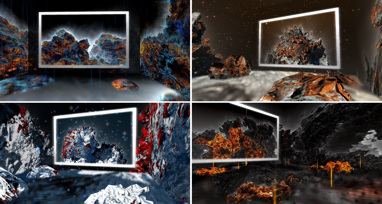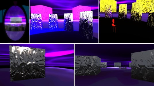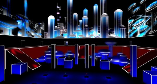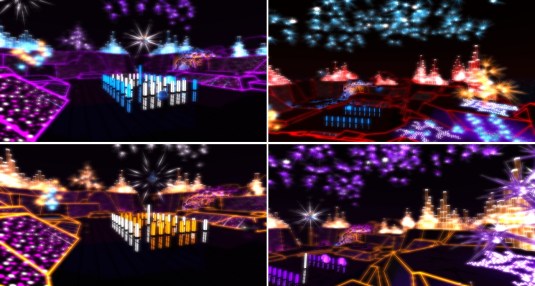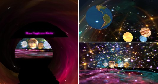 I zoomed out first in order to understand the installation. You land on the top of a planet or star. You’re surrounded by light, by glowing buildings, the ground is mostly covered with small objects in different colours, looking up you see smaller objects flying around followed by smaller particles so that they look like comets.
