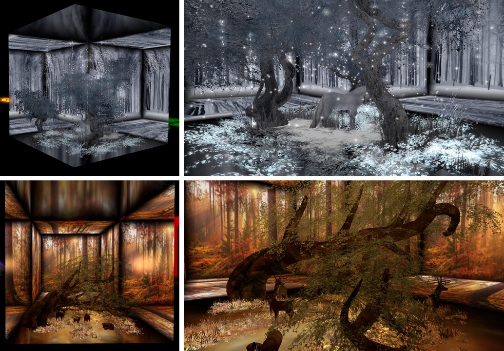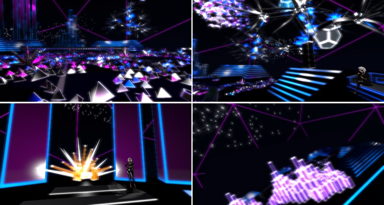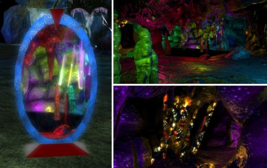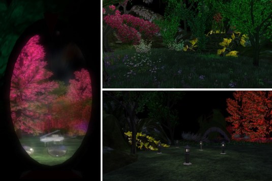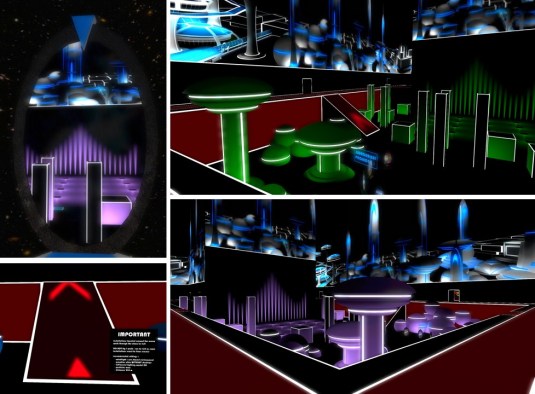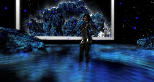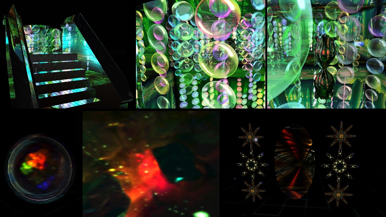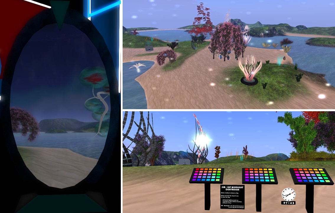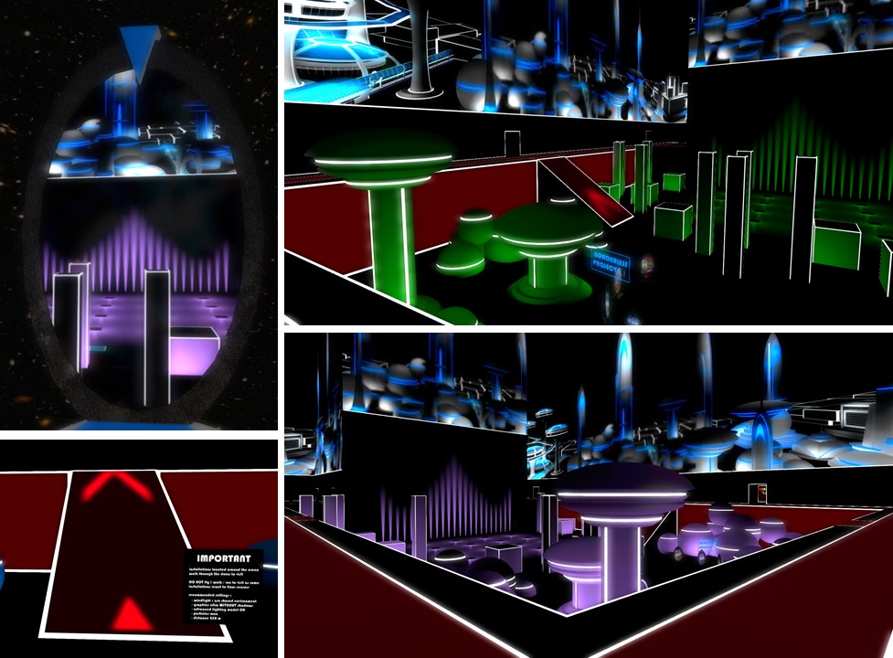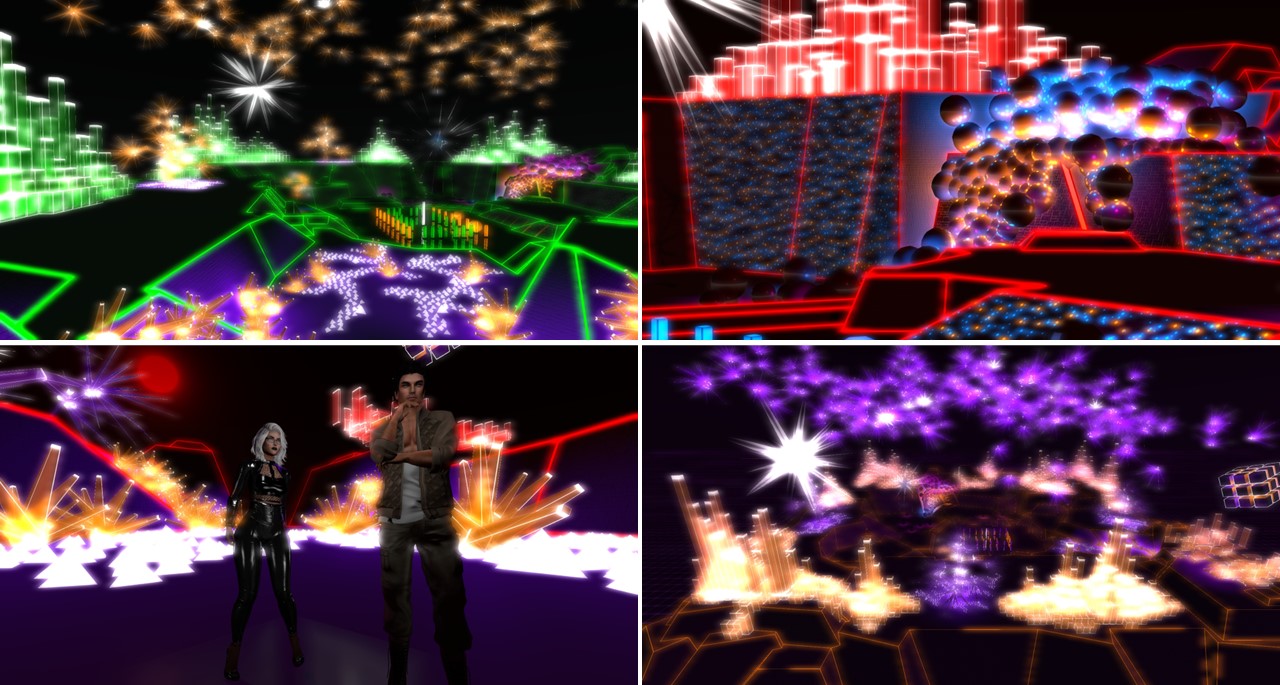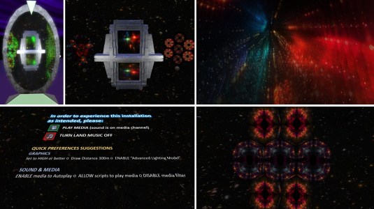 Gem Preiz: In all these builds I tried to play with reflections and lights and changes, either switching colors or adding movements of particles and physical objects here. It started in a closed place, kind of an underground maze, with “Lines of Lights“. “Color & Glow” sort of added a dimension, by opening the build to the sky and extend horizons. Here the colours change every 5 minutes. The last one, “A dark star“, is a combination of both, colours of the first, structures of the second, but adding another dimension, and the build, instead of being flat as many builds in SL, has become a whole 3D construction. It is surrounded by orbiters, and nested in an isotropic 3D universe of glowing lines, the boundaries of which are unreachable.