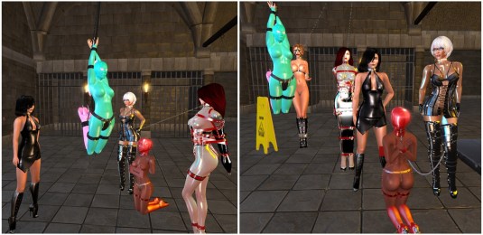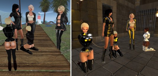 At night Mistress Jenny and I played a skipee with Flo first and caught up with our mutual news while we were playing. After the game we went to Psi’s realm with Flo. It was nicely crowded at Psi’s and there was some mainchat going on too. slave Holly showed up inworld while we were at Psi’s realm and of course we teased her. Gina (Gina Lytham) approached us, praising Flo’s strict suit. She seemed to be eager to swap places with Flo (or slave Holly?) but of course she denied it. Without further ado I took advantage of her accessible open collar and made her a seat for Mistress Jenny, who was happy to sit down after a long day.