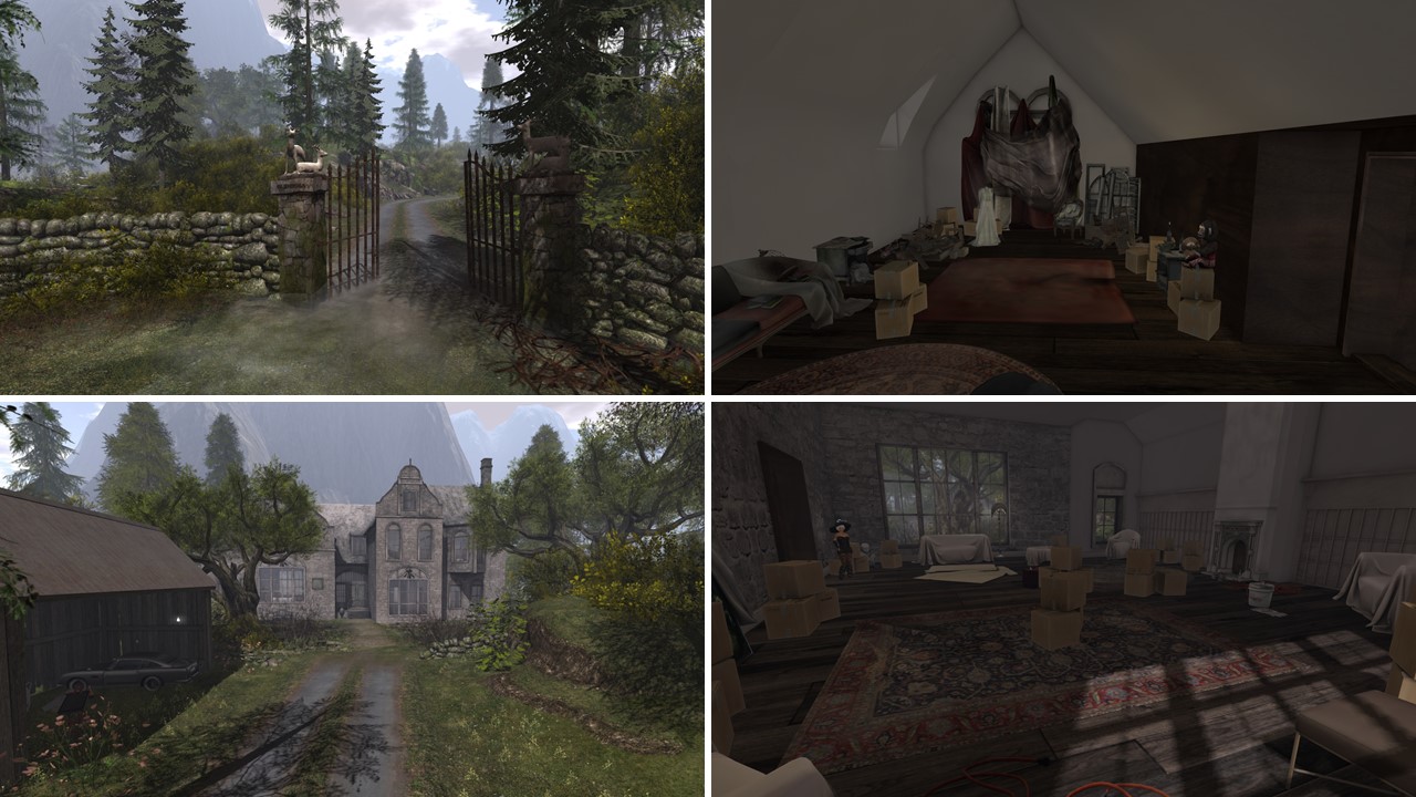 Glenrosa is a moderate homestead, an island surrounded by higher mountains. Upon landing you stand at a gate, with the name “Glenrosa” engraved into the gate posts. To me it seems like the entrance to a bigger property with a villa. I walked through the gate and followed the dirt road that acutally led me to a bigger house, a manor. It looked a bit abandoned. I walked inside and found it fully furnished, but most of the furniture was covered with sheets and moving boxes were piled up in some corners, the bookshelfs were empty. The other rooms and floors were similar mothballed and it felt somehoe a bit scary inside of the manor.