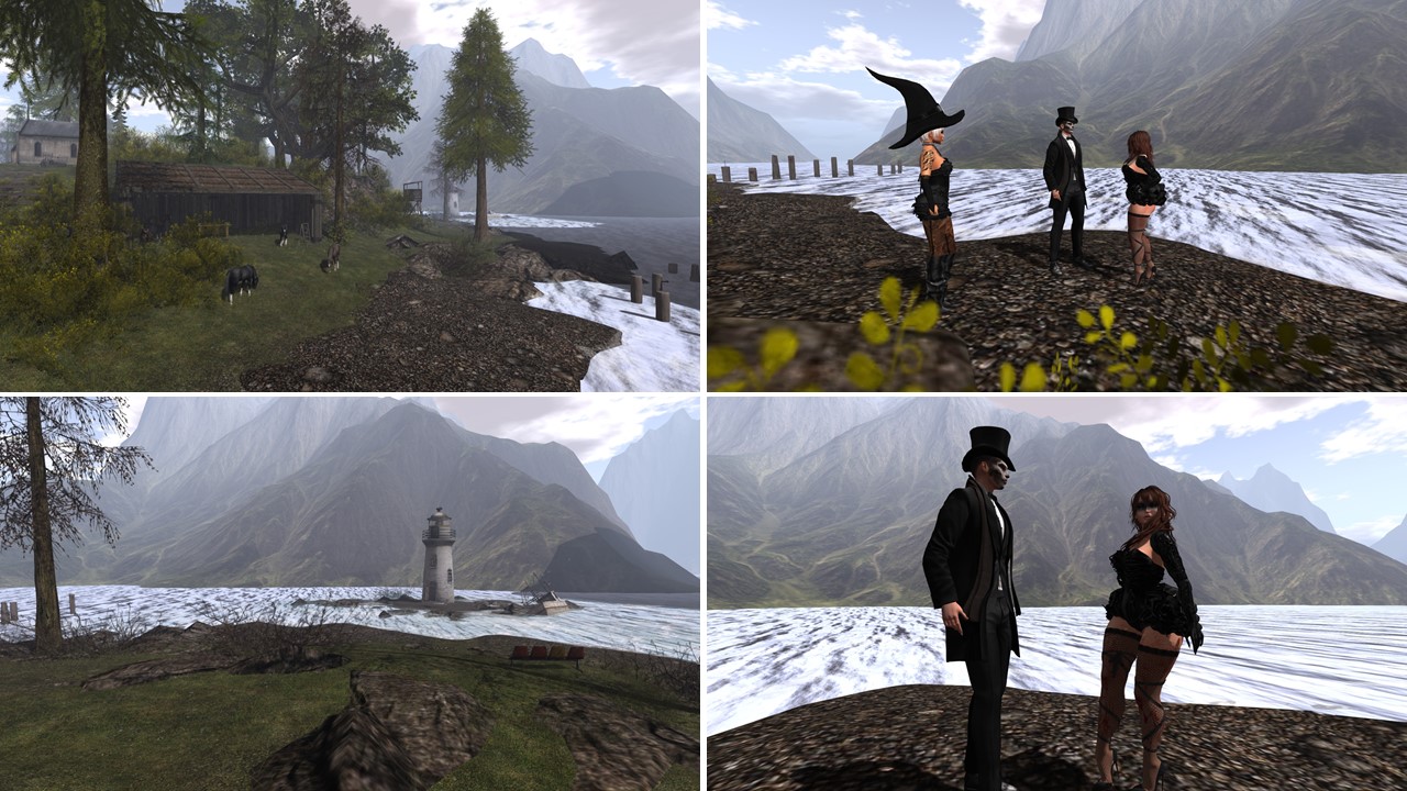 At the end of my simploring tour I met the owners of Glenrosa, Gabriel (gabriel4botto) and Brandi Monroe, who happened to be at the pebbly shore. They had been at an Halloween party the night before and were still wearing their costumes, just like myself. I wore a witch costume from our Friday night party the day before.