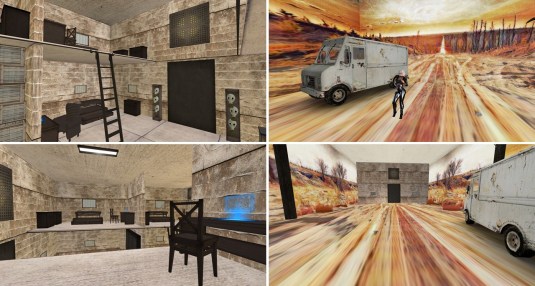 Actually Memory Gongs consists of three galleries that are built in several connected buildings. One is called The First Life Gallery, the other The Second Life Gallery and the third The Erotic Gallery. When you zoom out you can recognize the three different galleries. Each gallery has a different base colour outside as well as inside. The landing is at the entrance to all three galleries.