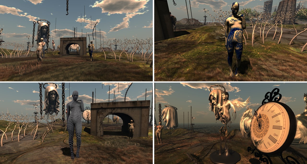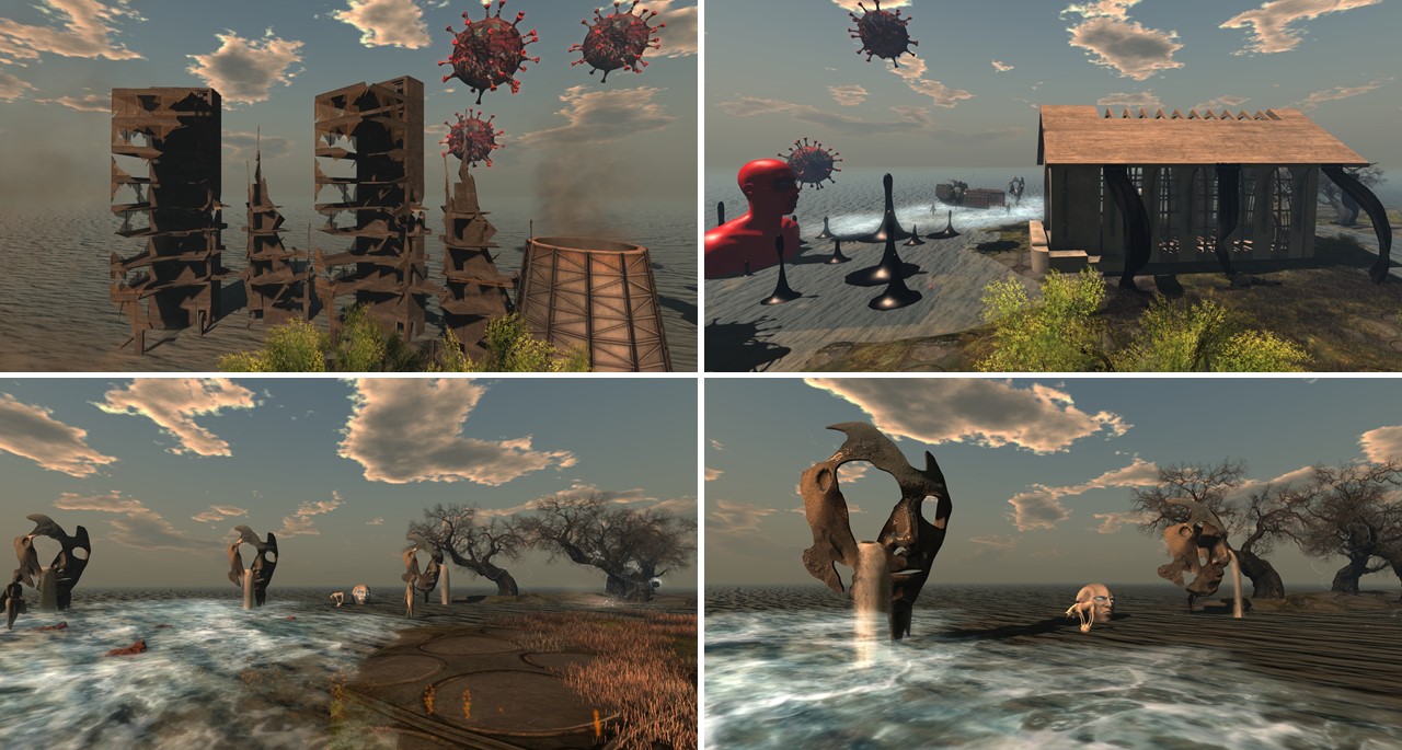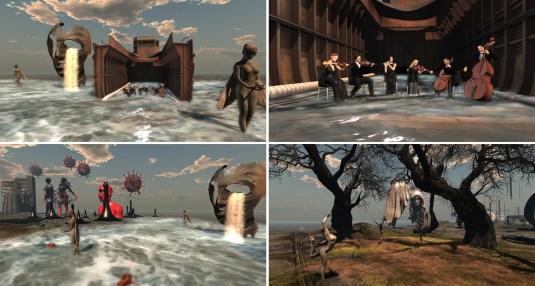 The landing is just in front of a large church. Scattered around the whole sim you find interpretations and elements that refer to the virus, to the quarantine time, to social distancing, to the fear of dead, to dead itself, to religion and to loneliness and the halt of all life as we know it.