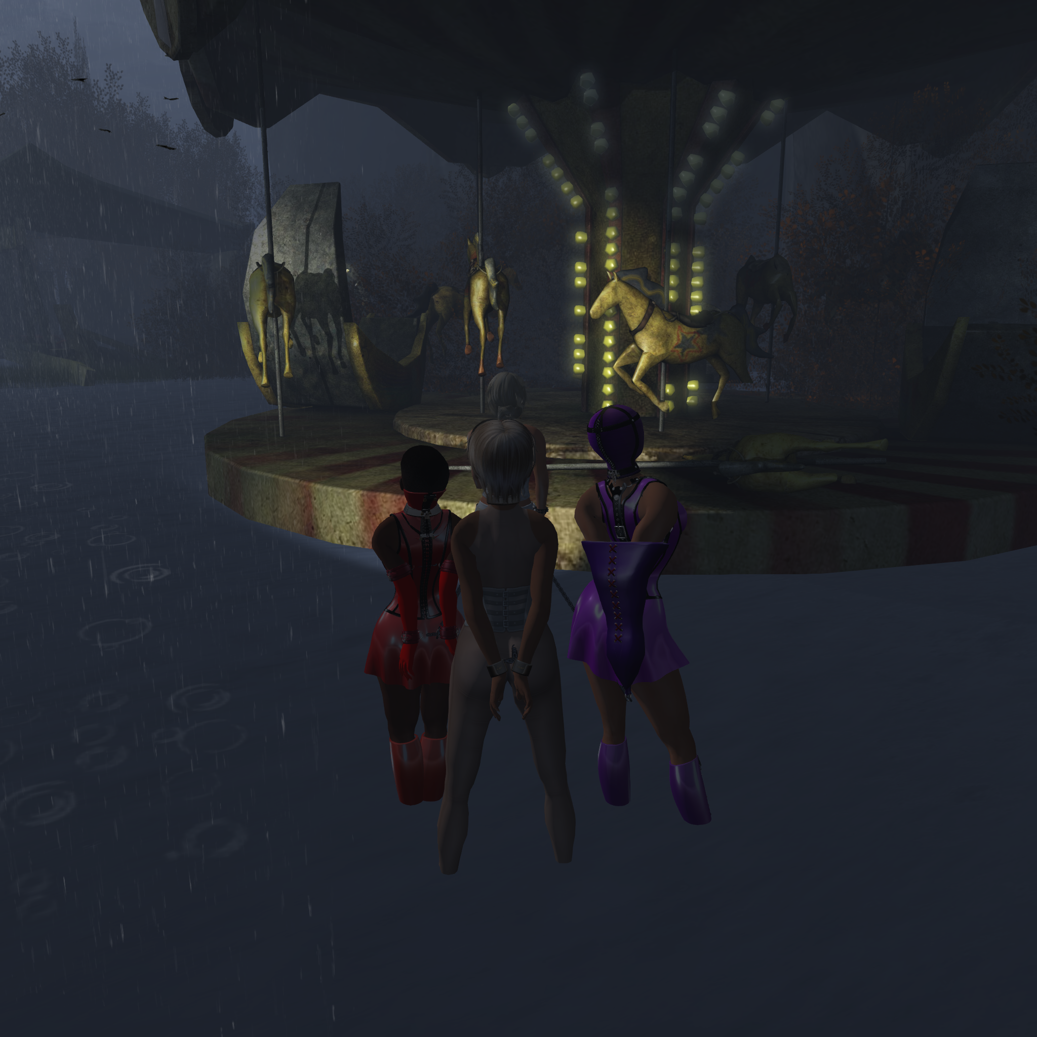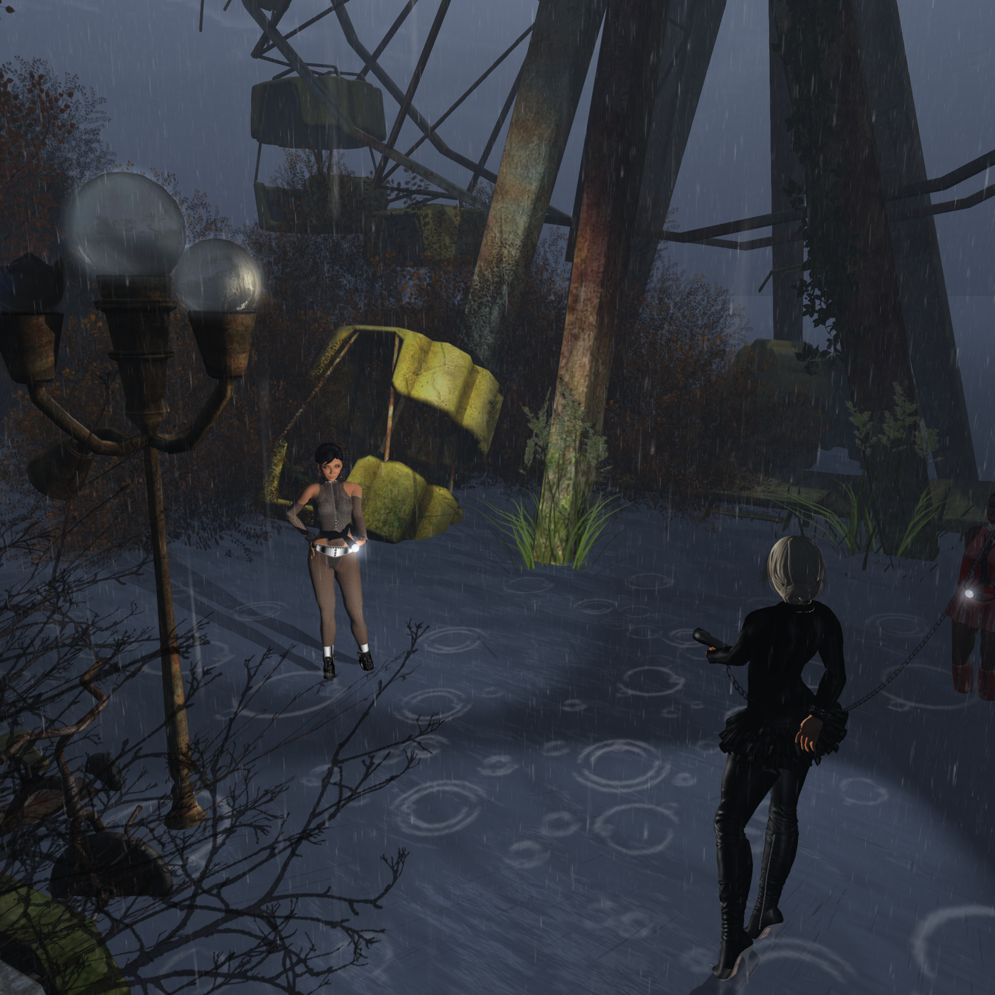 I went to Ironwood Hills several times, the first time together with sklavin, slave Flo and slave Ashley. In one part it is heavily raining and there are the rests of a parish fair with a carrousel and a big weel. It is raining cats and dogs and so heavy that you literally walk through a sea. And the flashlight makes the scenery sort of unreal.