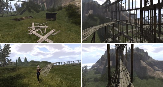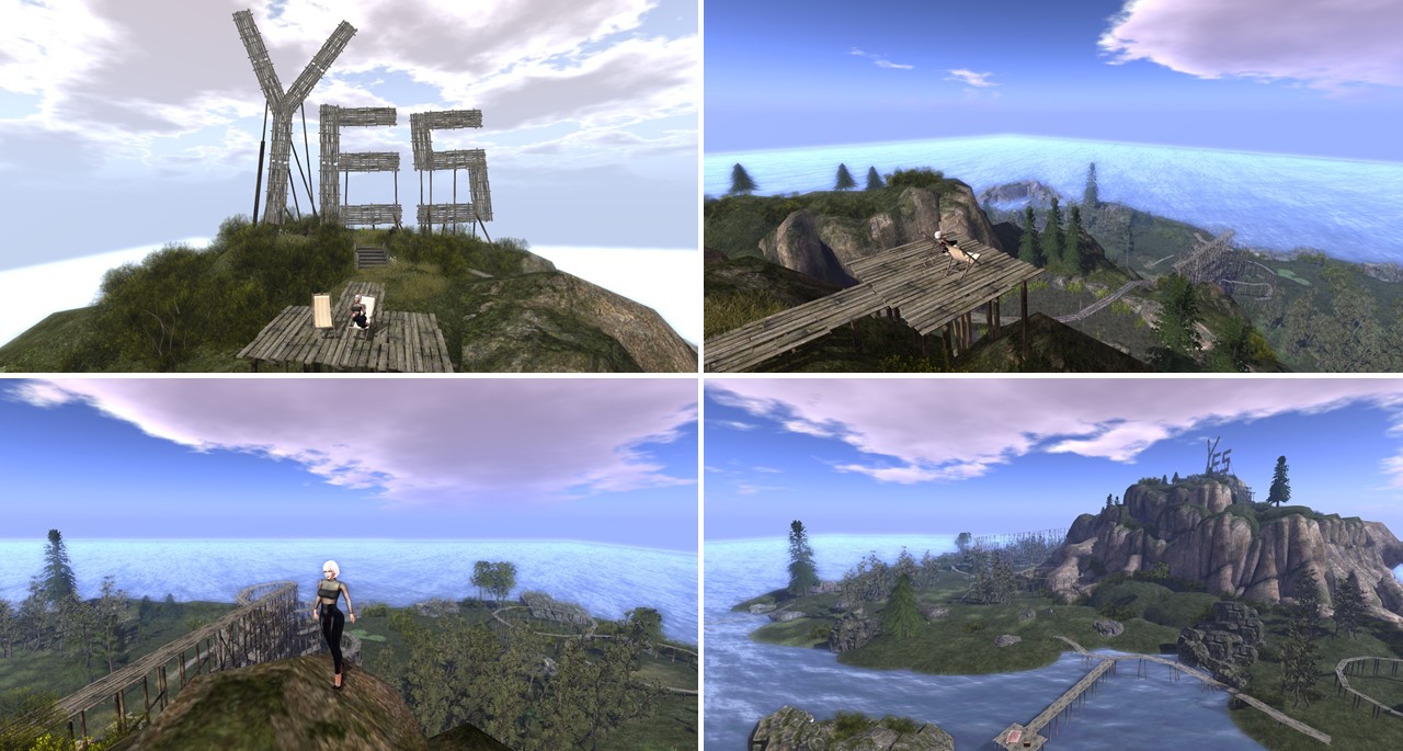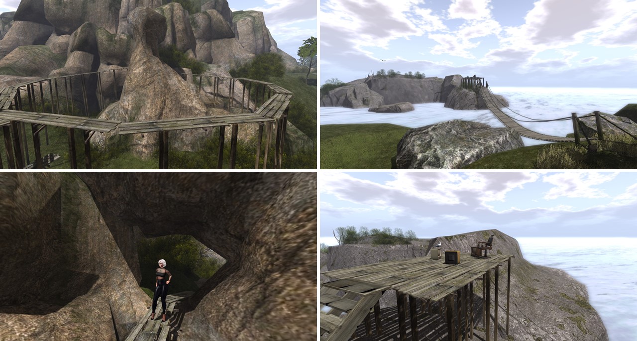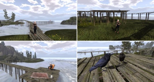 I returned the the landing point and went into the other direction and up the hill at the end of the road. There is a landmark. A robot made of scrap parts. It seemingly guards the sim and seems to be a good fellow. From the hill you see down to a wooden path and there’s a cosy spot to watch the fish and seagulls.